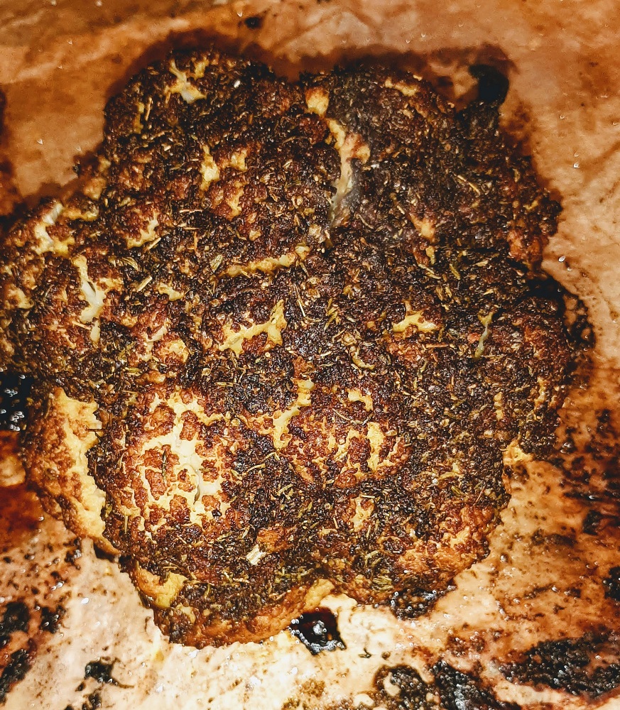 *Place in the oven and cook for 30 to 45 minutes, again depending on the size of the cauliflower. You want it tender enough to eat but not falling apart.