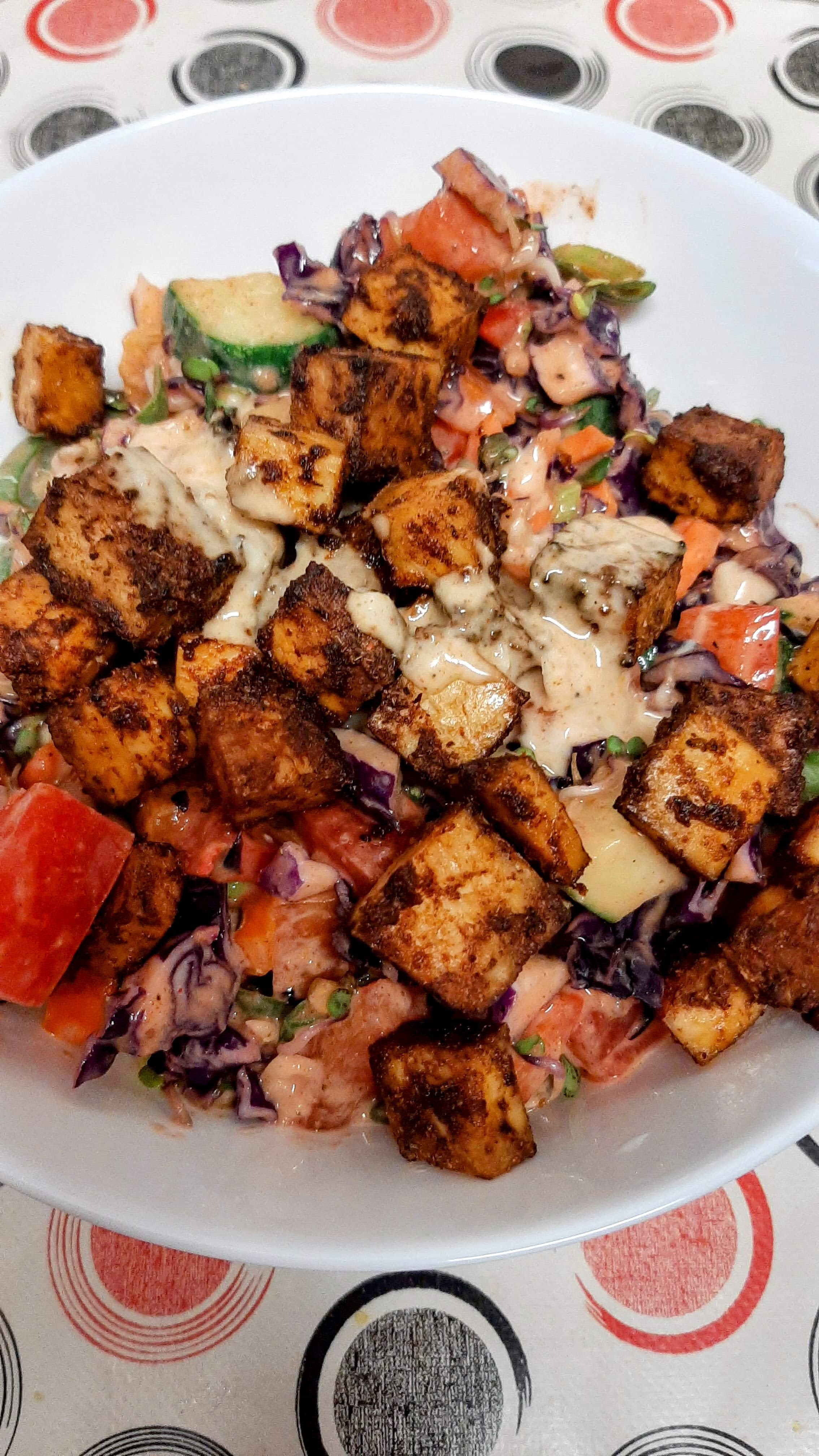 -In a small mixing bowl add garlic, lemon juice and zest, cumin and dill. Mix until blended and toss, using leftovers to drizzle over the tofu on top.