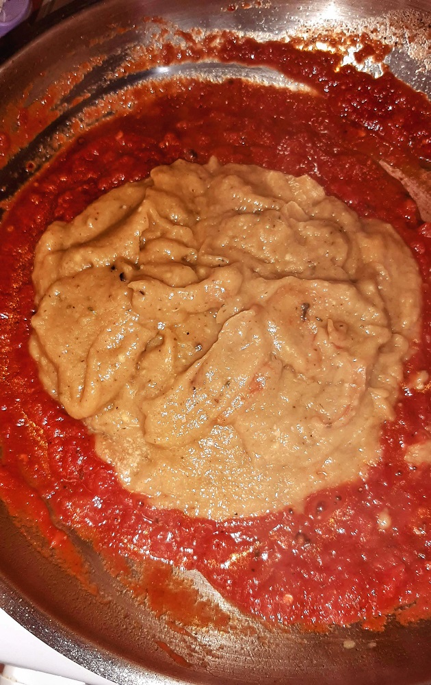 *Add chili peppers to a warm skillet and just when you begin to smell them, add the tomato sauce and cook about 5 minutes until it’s nice and thick. Then add eggplant mixture.