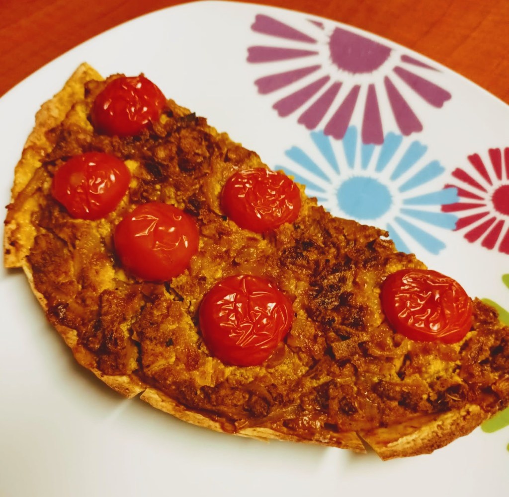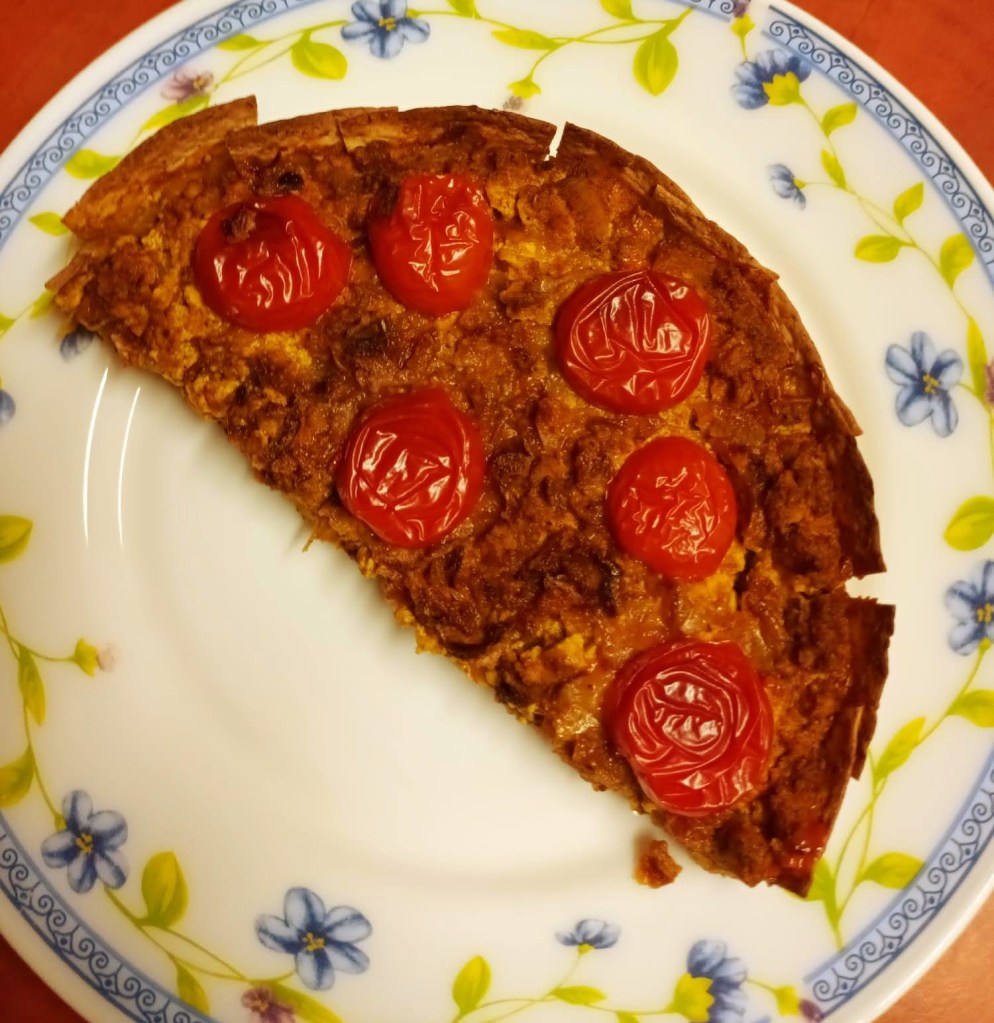 The bottom layer of this vegan tofu pie is a tortilla shell. He used our new silicon baking tray to form the base of the pie. The rest of the pie is tofu, mashed with a fork, sliced grilled onions, TVP, nutritional yeast and cherry tomatoes which were cooked on top until they burst.
