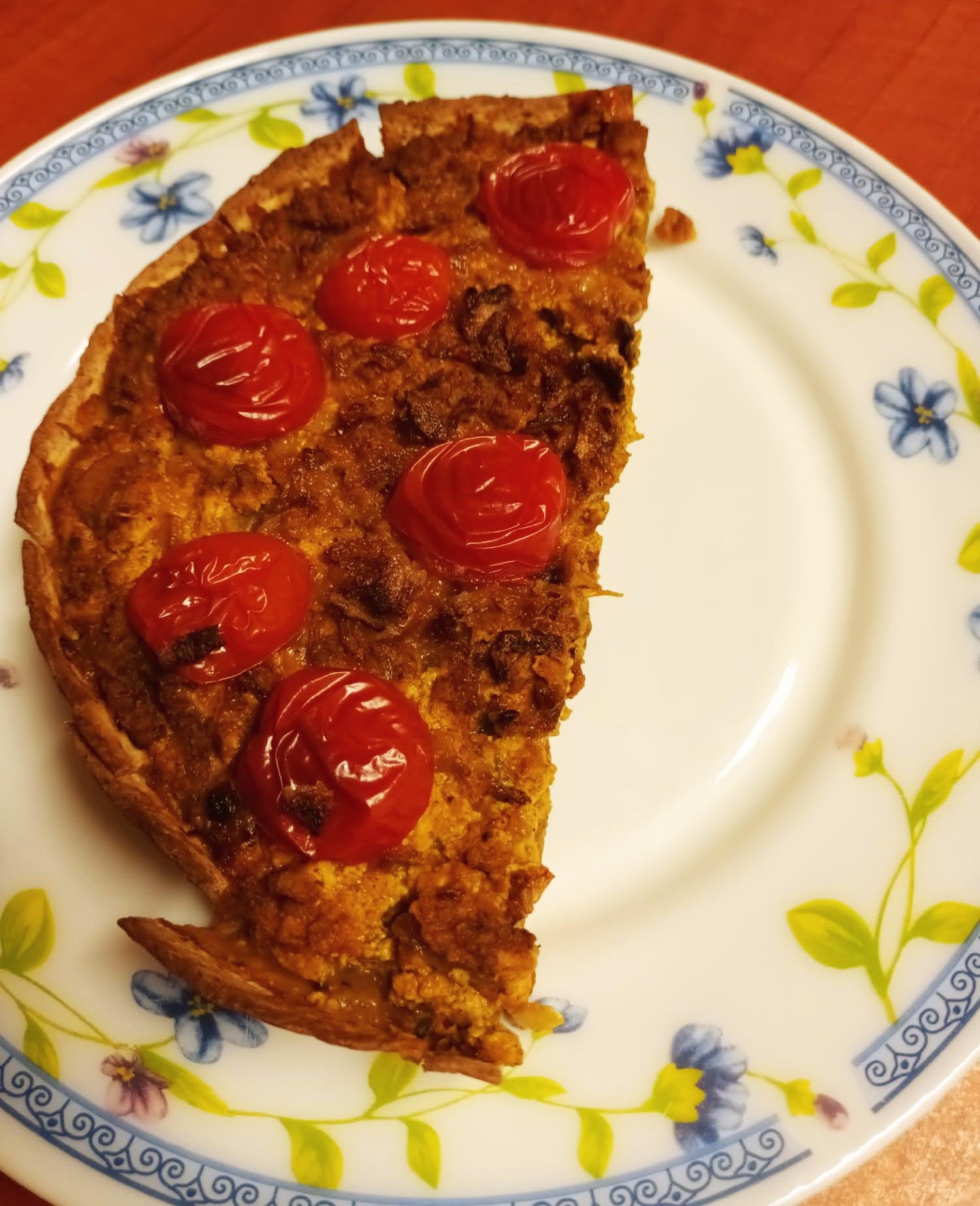 The bottom layer of this vegan tofu pie is a tortilla shell. He used our new silicon baking tray to form the base of the pie. The rest of the pie is tofu, mashed with a fork, sliced grilled onions, TVP, nutritional yeast and cherry tomatoes which were cooked on top until they burst.