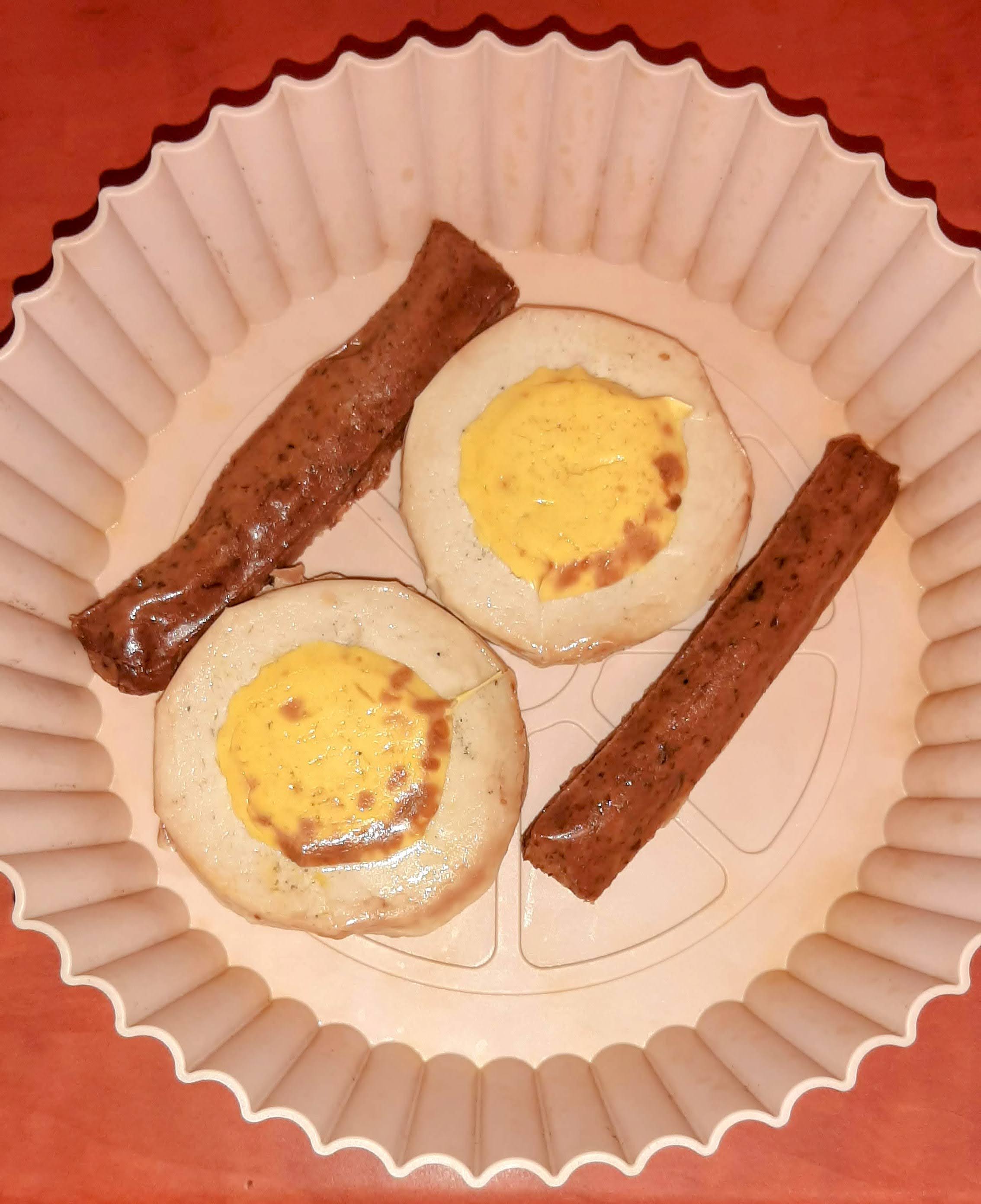 We cooked them in the air fryer, using a silicon bowl just in case the vegan sausage ended up being very fatty, which it thankfully was not. The setting was on 200C for 3 minutes on the whole thing and they were warm-ish so I would recommend about 4 to 4:30 for a cook time.