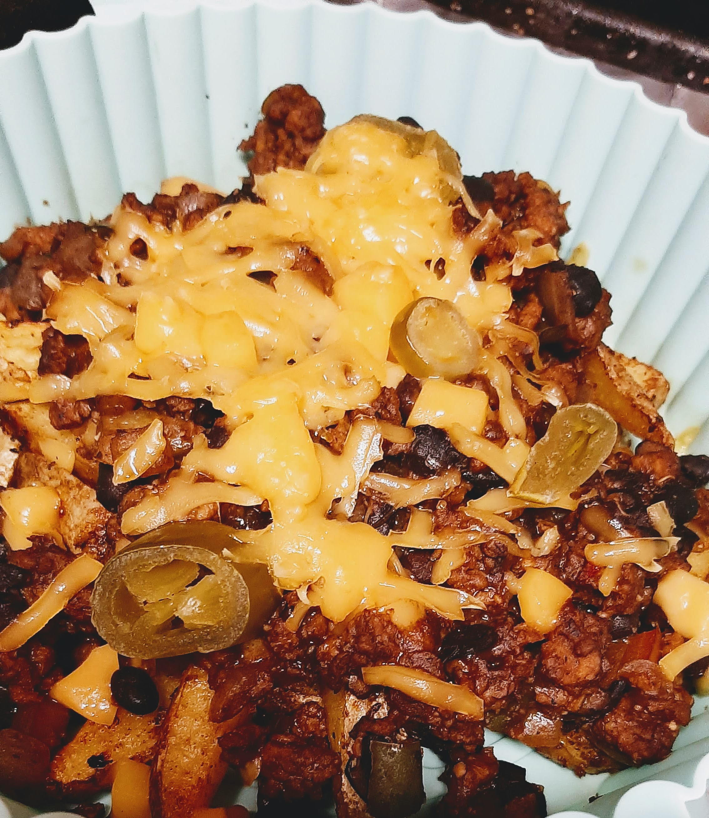 *Pour black bean and vegan mince mixture over the potatoes and add any other toppings you want, including: black olives, vegan sour cream, salsa or elote.