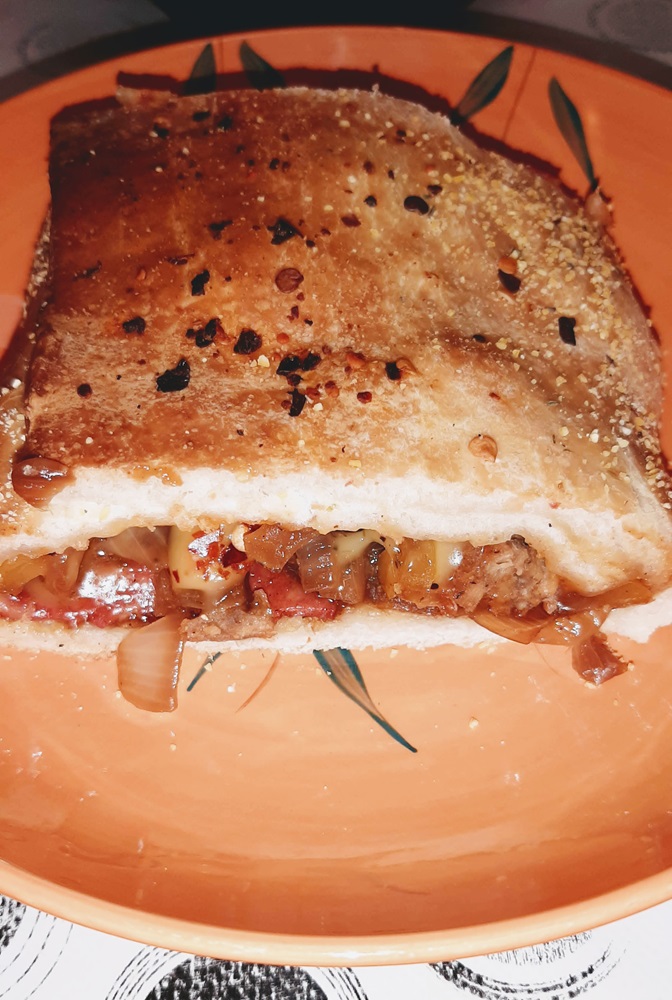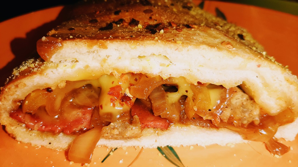 And not just recreated and veganized, but for me this is a throwback episode from my college days. Back in Charleston when I attended good ol’ Eastern Illinois University, there was this restaurant called Jerry’s (which oddly enough there is also a pizza chain here in Romania called Jerry’s) and they made a delicious stromboli. It was filled with vegetables, sausage, chicken and some kind of ham, of course lots and lots (and lots) of cheese. I LOVED it and whenever we held Mock Trial meetings there, that’s what I would get.