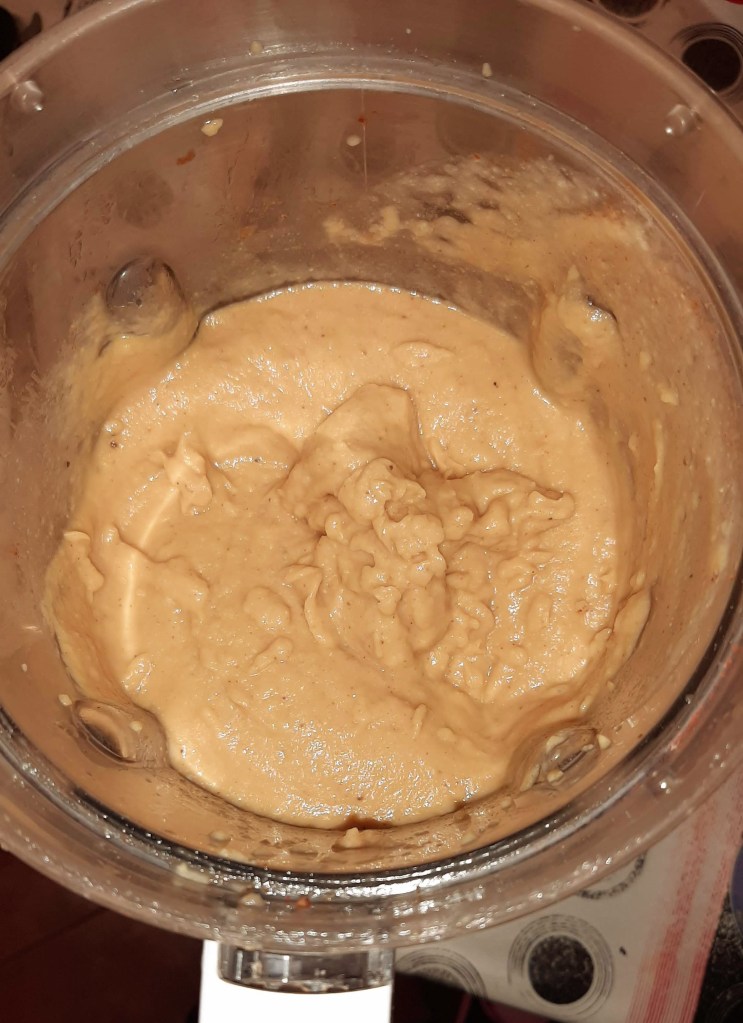 *Add to food processor and run until smooth and creamy. It may take a few spins in the food processor and you WILL have to add a bit of liquid as you go unless you have the Iron Man created food processor, which I do not.