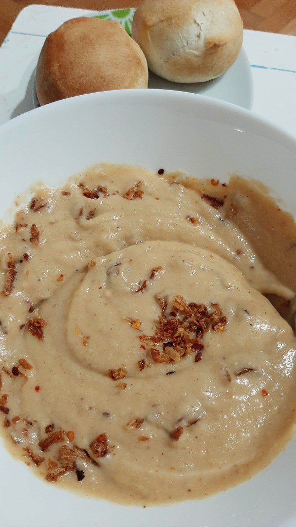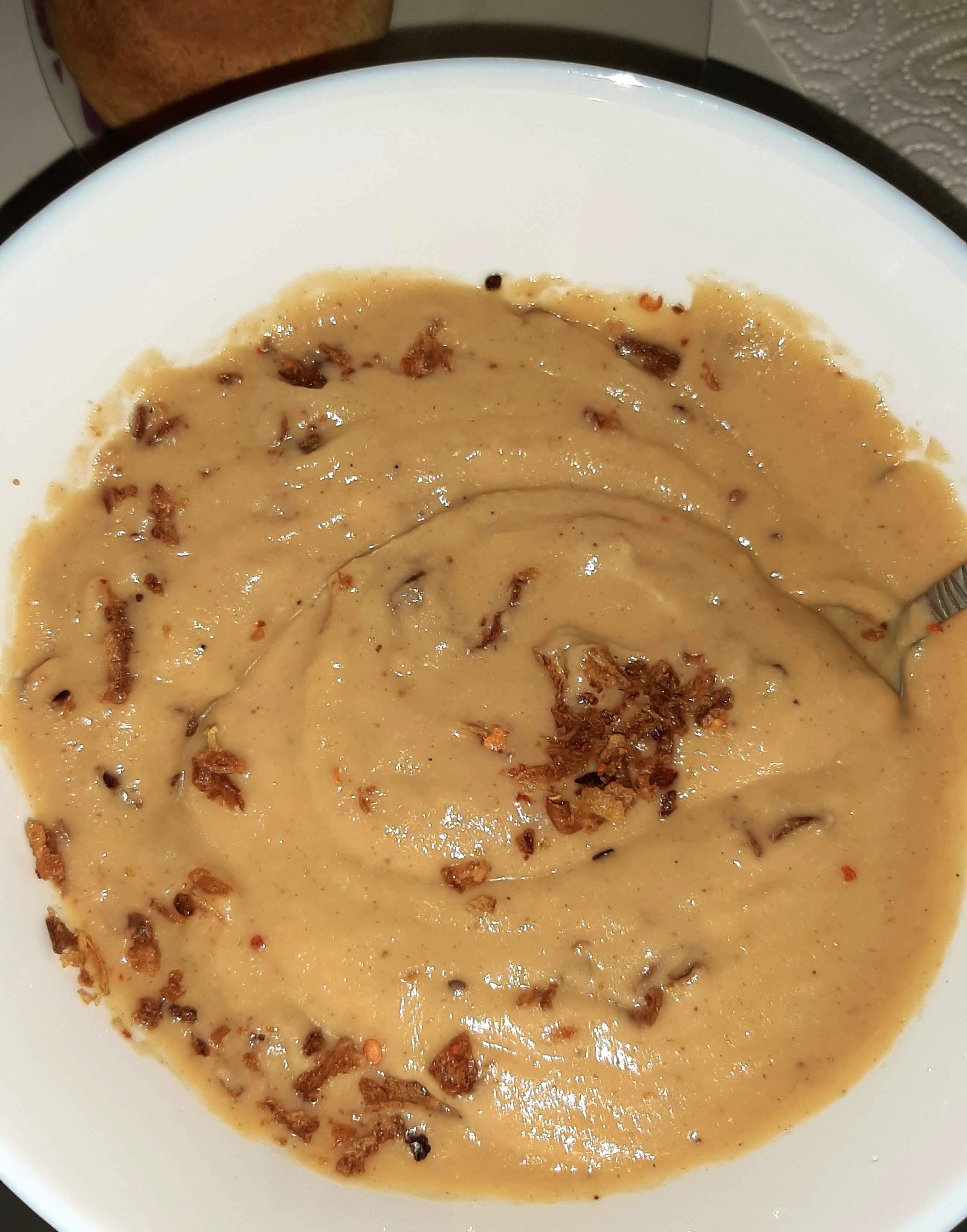 *It might take some effort but you’ll need to run the process and then scrape down the sides and stir until your vegan cauliflower bisque is smooth and creamy.