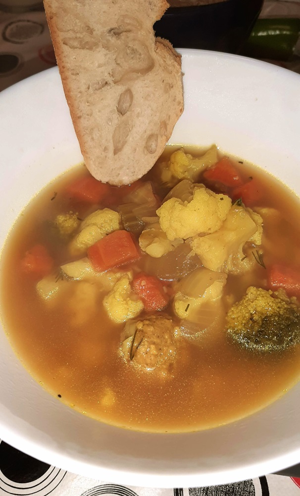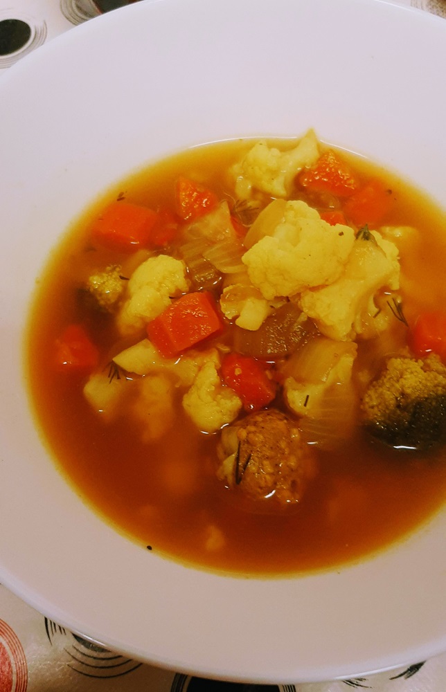 *Bring the soup to a boil and reduce to a simmer about 10 minutes or until cauliflower is almost fork tender. Add broccoli, vegan meatballs, and stir.