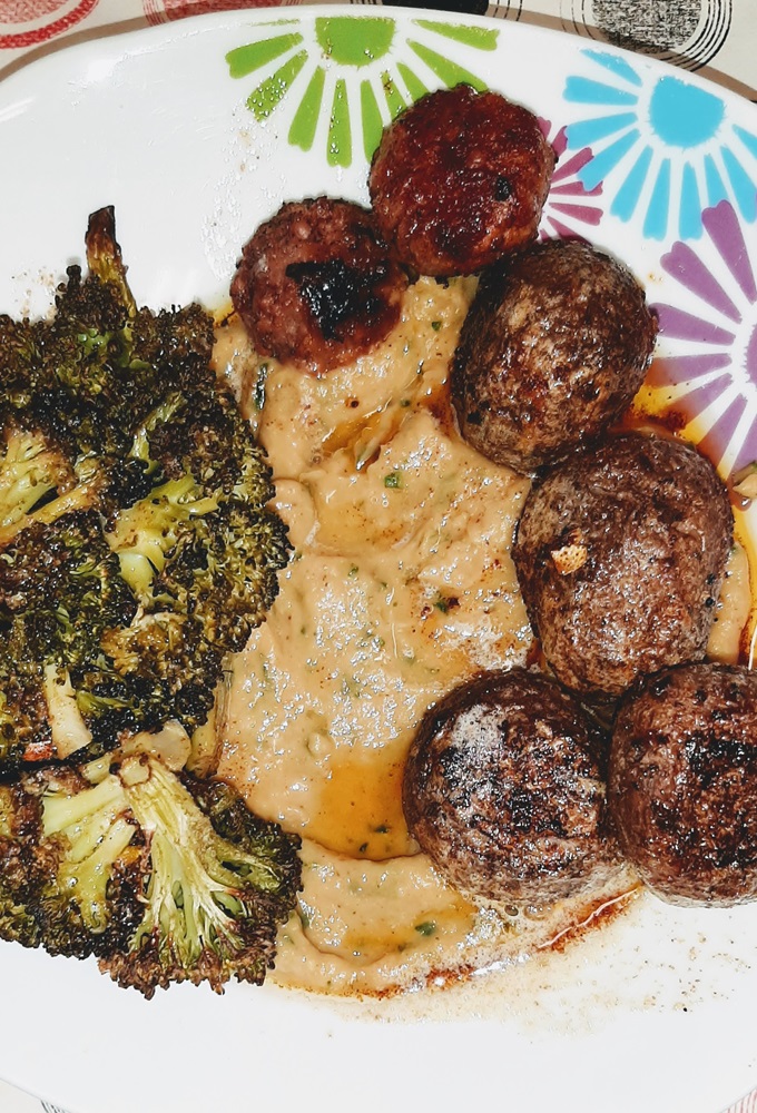 *Give the potatoes a poke to see if they need more time. Do the same for the broccoli. If they need more time, this is a good time to add the vegan balls or another vegan meat alternative.