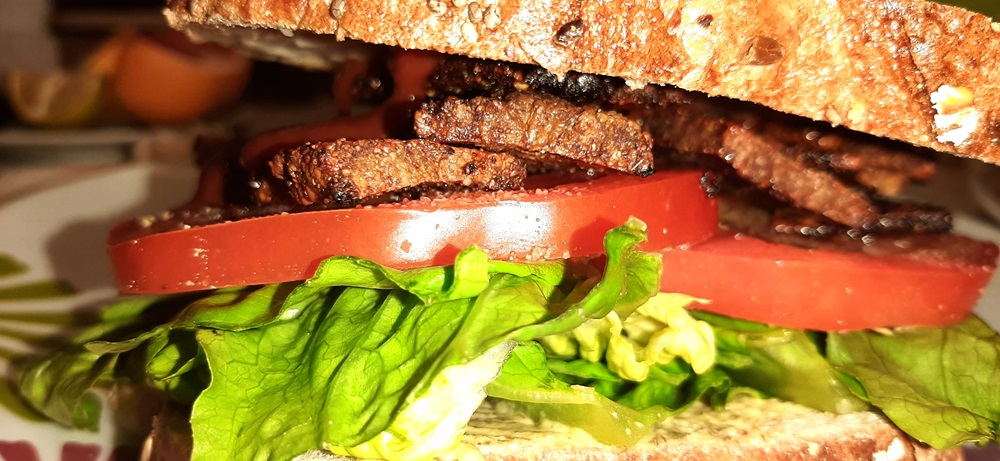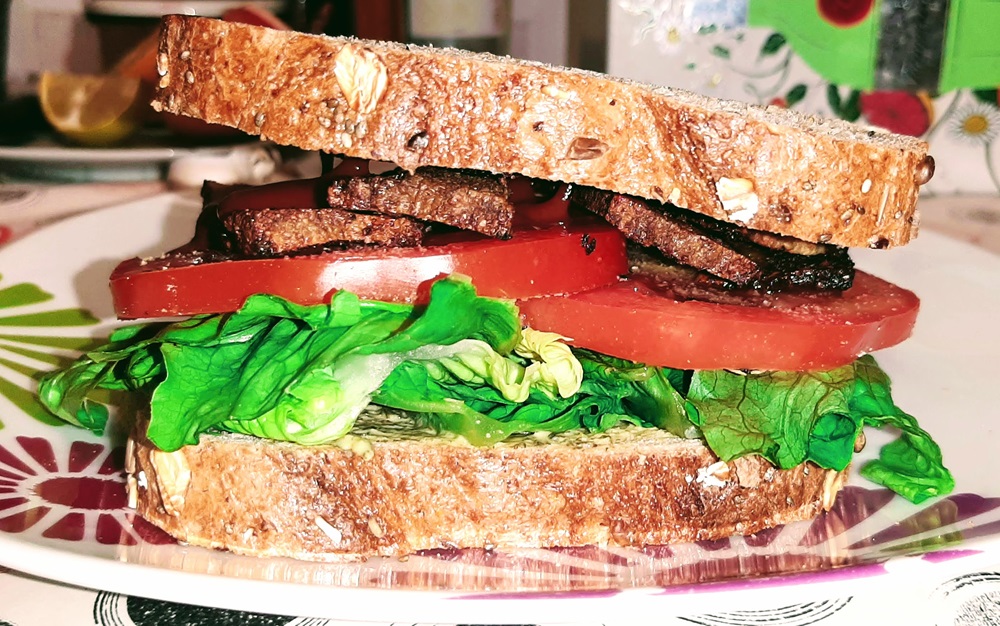 From top to bottom, (bread & sauce) – vegan bacon – tomato – lettuce – (more bread & sauce). That’s it, your vegan sandwich recipe for this week.