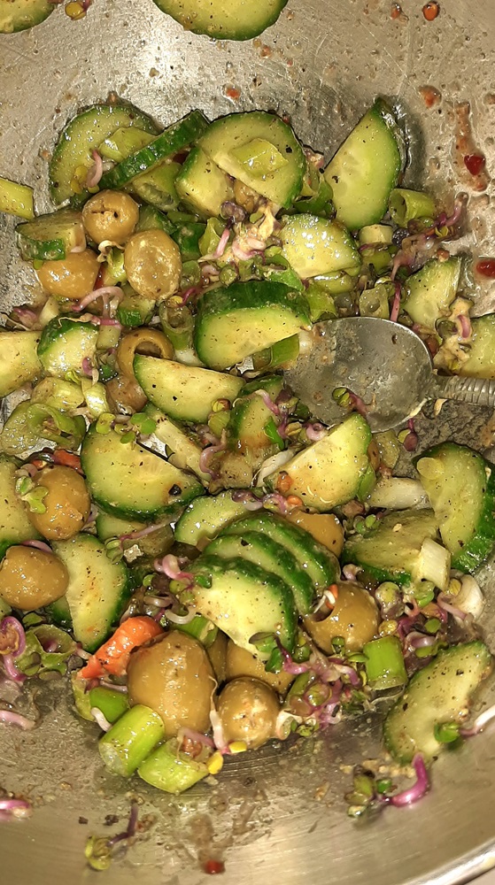 If you’re like me, most meals, especially lunch, just don’t feel right if there’s nothing on the side. It feels, I don’t know, naked or incomplete. So what do you pair this vegan BLT with? A salad, of course! But not any old salad, I chose an olive and cucumber salad which sound weird, but it was tasty and flavorful and the perfect little side dish to this quick and easy vegan lunch.