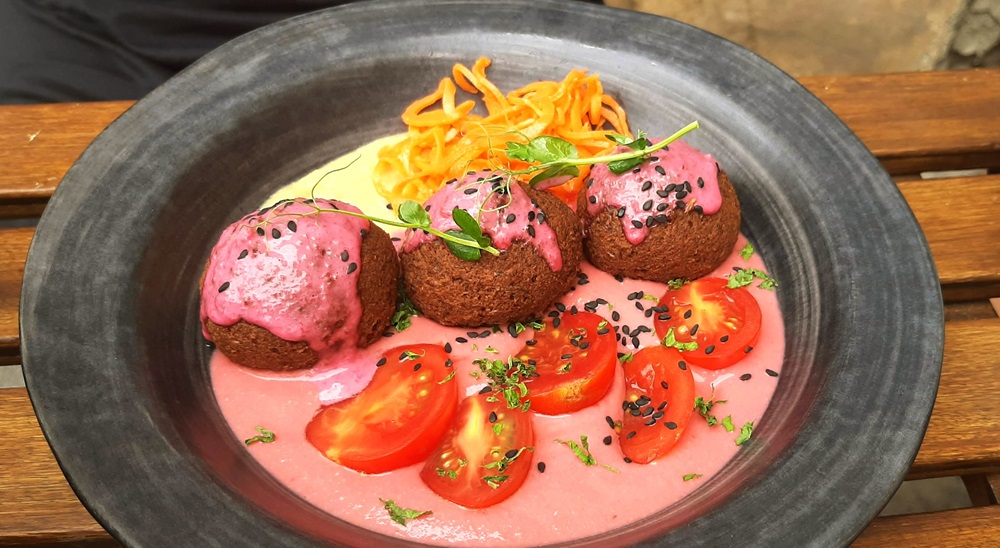 I wanted the vegan shakshuka but they were out of it so I pouted for three seconds and moved on to a falafel plate with two types of hummus (chickpea & beet), carrot noodles and bread. The Hubs ordered a creamy tofu scramble that was incredible.