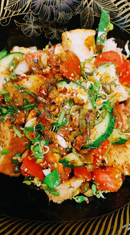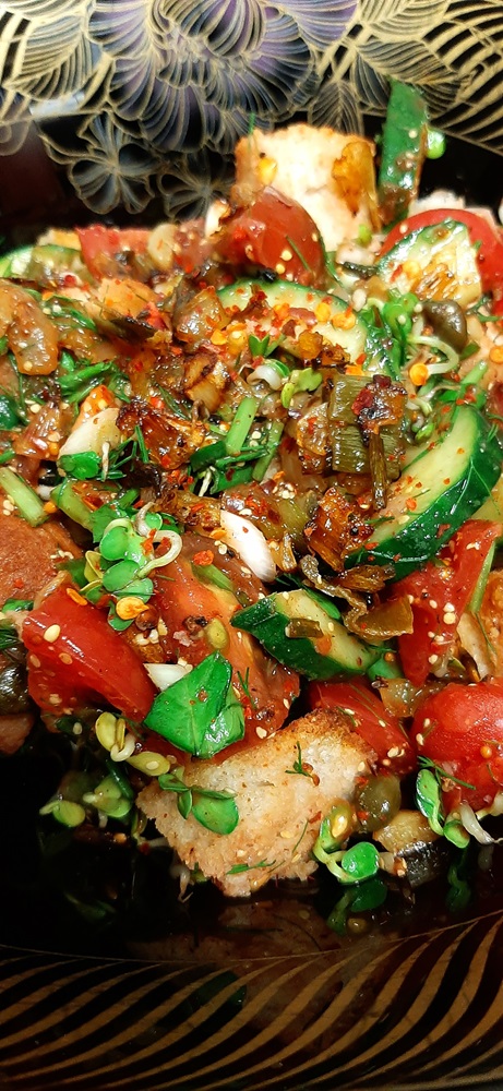This is quickly becoming a favorite vegan salad of mine because we usually have little bit of leftover bread from the bakery. BTW, have I ever told you just how many bakeries there are in Romania? They are as bountiful as Starbucks in the U.S. and sure you can get some of them everywhere but each bakery has a few unique options that makes it a treat to just stop at a bakery and see what they have.
