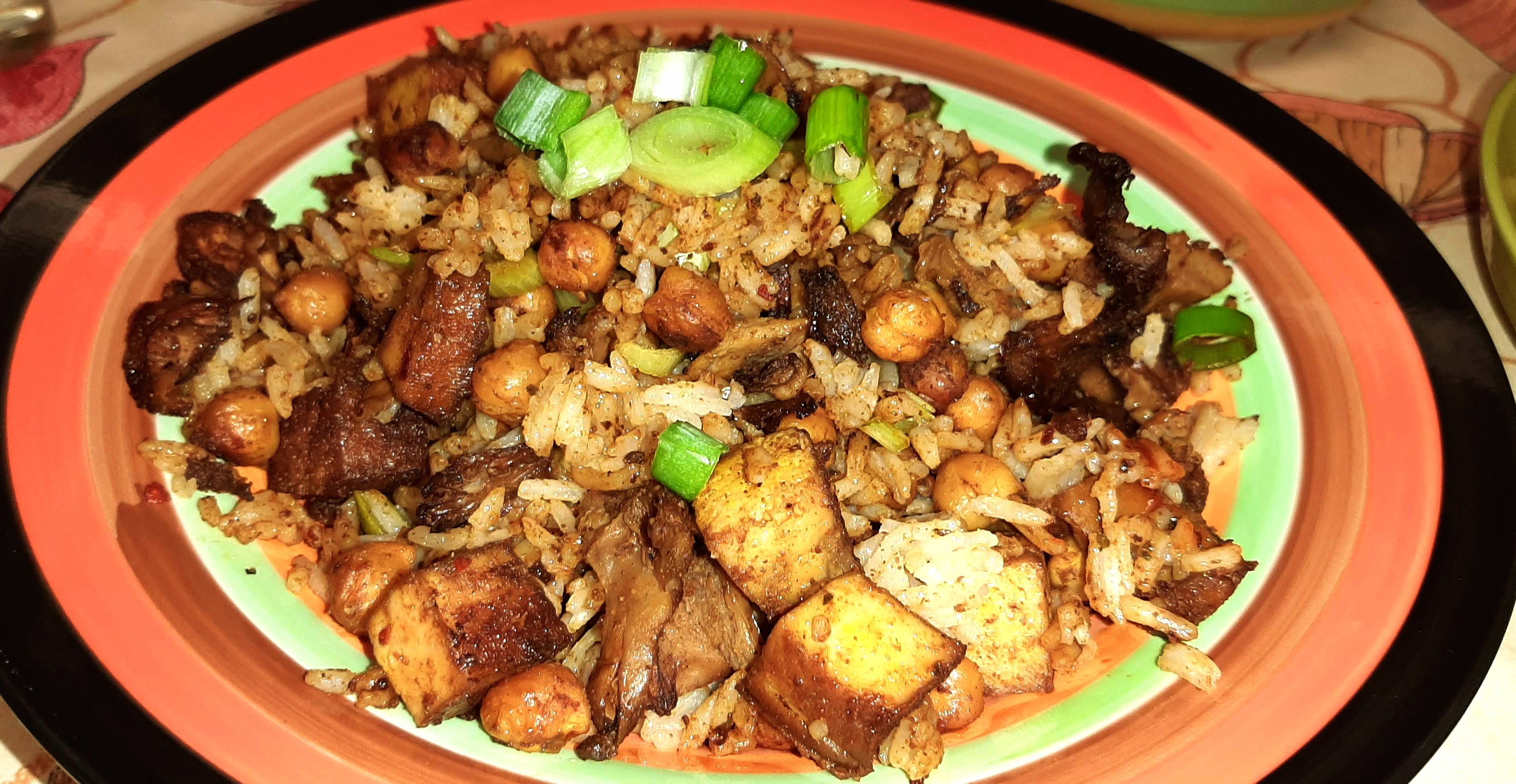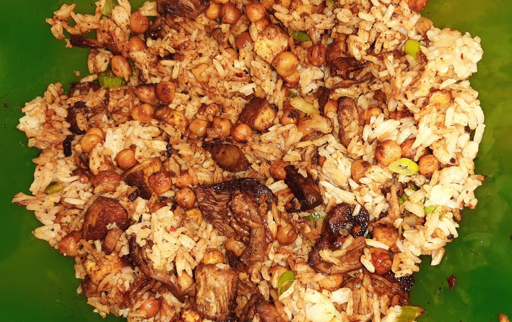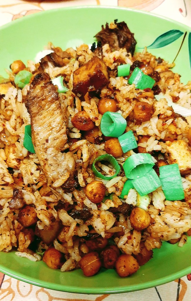 *Fluff rice with a fork and add it to a large mixing bowl, along with the mushrooms, smoked tofu and raw scallions. Add soy sauce and additional seasoning as desired.