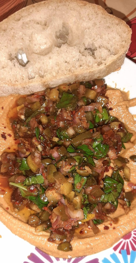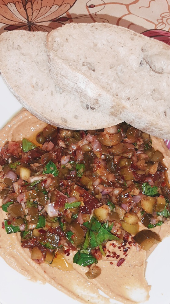 When you assemble it, place the hummus or other bean puree on the bottom of the plate or bowl. Top with the triple pickle dip, spreading it around evenly and then add the toasted bread on the sides. It’s not a very big or complicated dish, but it will definitely satisfy your hunger which makes it perfect as a midday meal or even a late dinner if you don’t have time to do anything more.