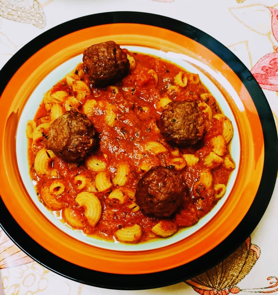 The first dish is his and it is a homemade red sauce with vegan meatballs and elbow pasta.