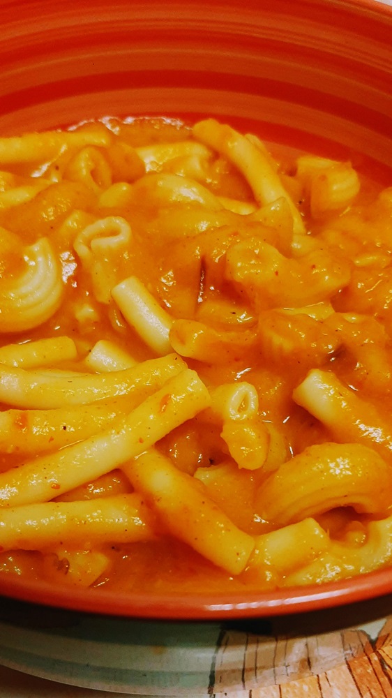 Ingredients: Butternut squash, pasta, onion, garlic, almond milk (unsweetened), parsnip, red pepper paste & nutritional yeast.
