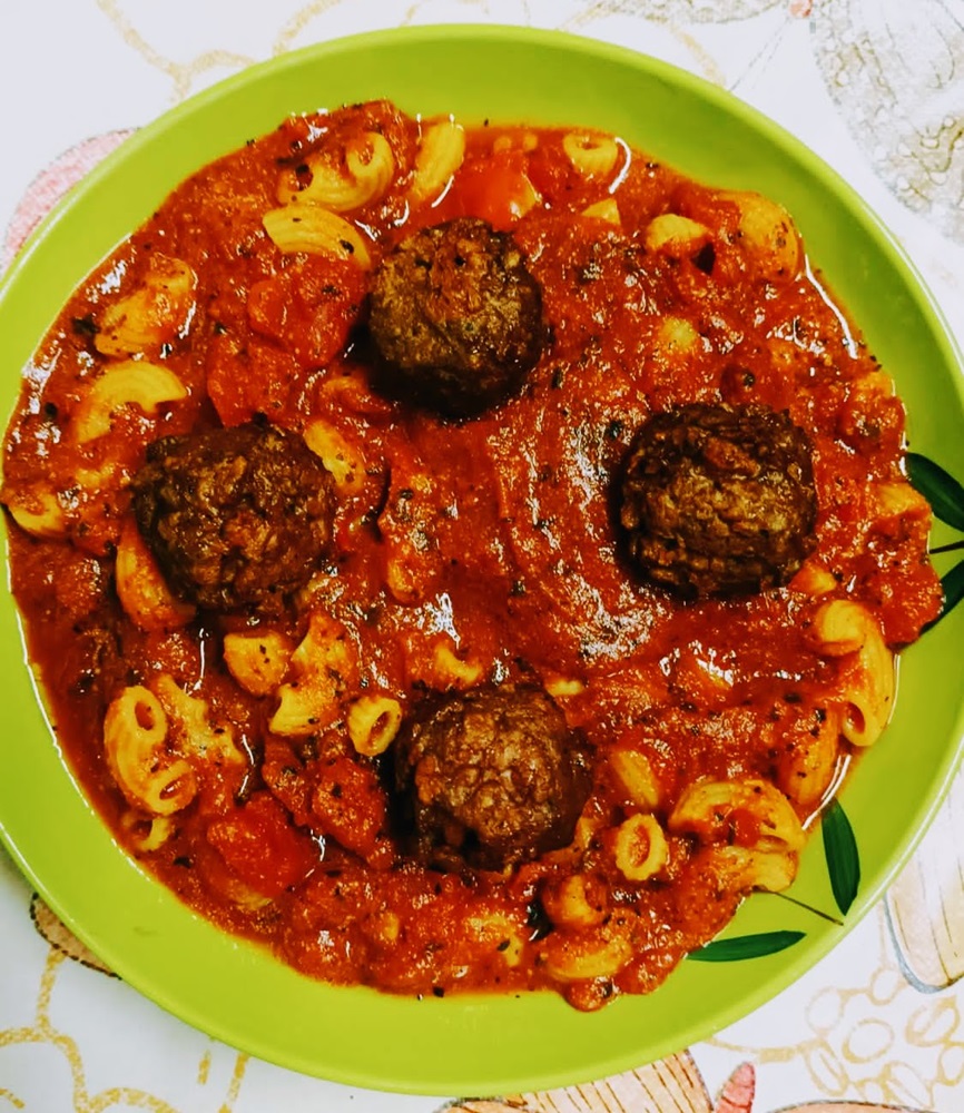 Ingredients: Pasta, onion, garlic, bell peppers, crushed or chop tomatoes, oregano, thyme, marjoram, basil & vegan meatballs.
