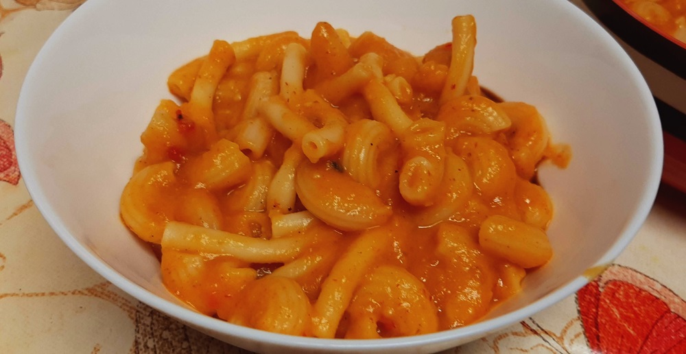 Ingredients: Butternut squash, pasta, onion, garlic, almond milk (unsweetened), parsnip, red pepper paste & nutritional yeast.