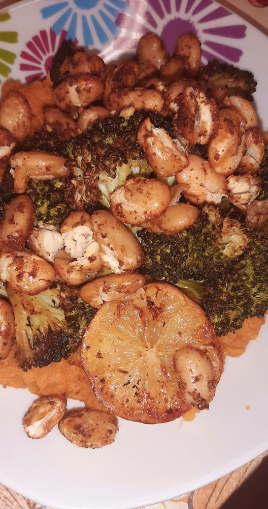 Once everything is cooked, it’s time to plate up! Start with a generous scoop of miso mashed sweet potatoes as your base. Top it with roasted broccoli and sprinkle those spiced air-fried butter beans on top for added crunch.