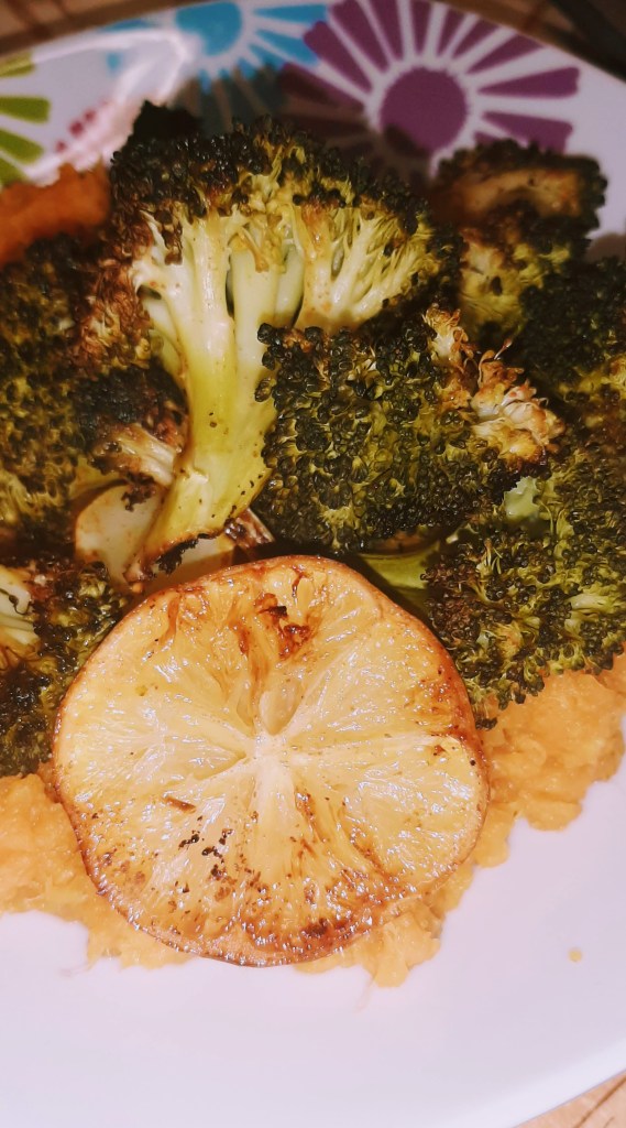 *On a baking sheet, toss the broccoli florets with lemon juice, salt, pepper, and garlic powder if using. Spread them out in a single layer.