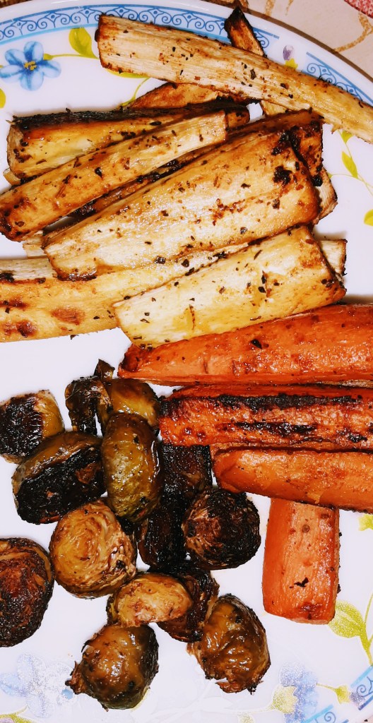 I saw this recipe on Instagram but an awesome vegan creator called veganezer. It was a simple roasted carrot & parsnip recipe on top of a yummy creamy sauce and I wanted to make it as it, but the parsnips at the market were GI-NORMOUS so I had to get creative. I cut the parsnips and the carrots in half width wise and quartered lengthwise. And I added halved Brussels sprouts.