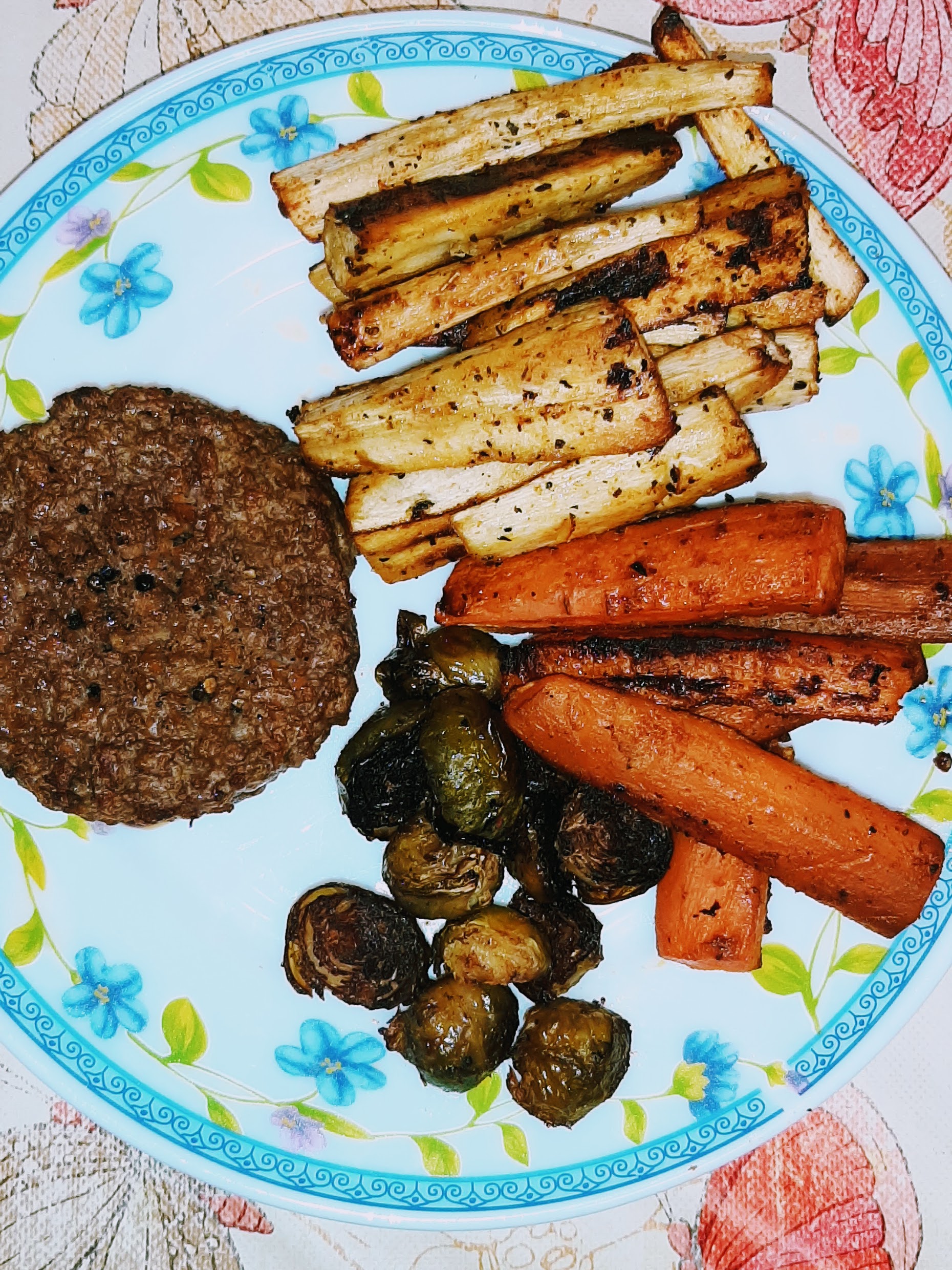 I saw this recipe on Instagram but an awesome vegan creator called veganezer. It was a simple roasted carrot & parsnip recipe on top of a yummy creamy sauce and I wanted to make it as it, but the parsnips at the market were GI-NORMOUS so I had to get creative. I cut the parsnips and the carrots in half width wise and quartered lengthwise. And I added halved Brussels sprouts.