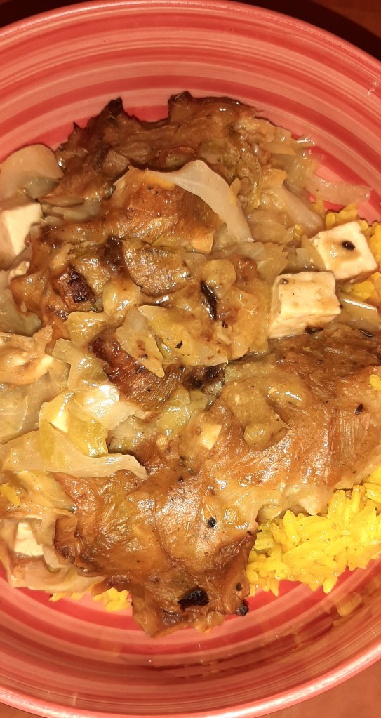 *Add sliced onion and leeks as well as chopped smoked tofu. Stir regularly to avoid sticking, adding more broth or water as necessary until slightly browned at the edges.