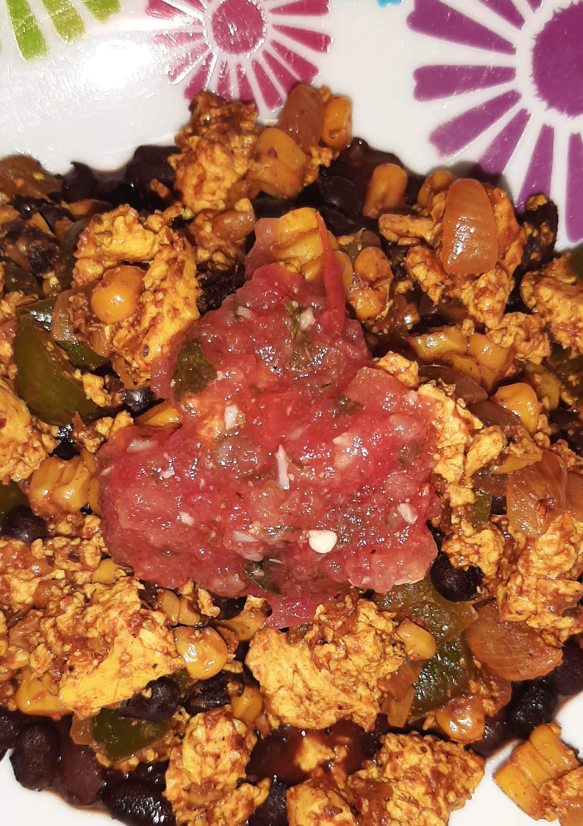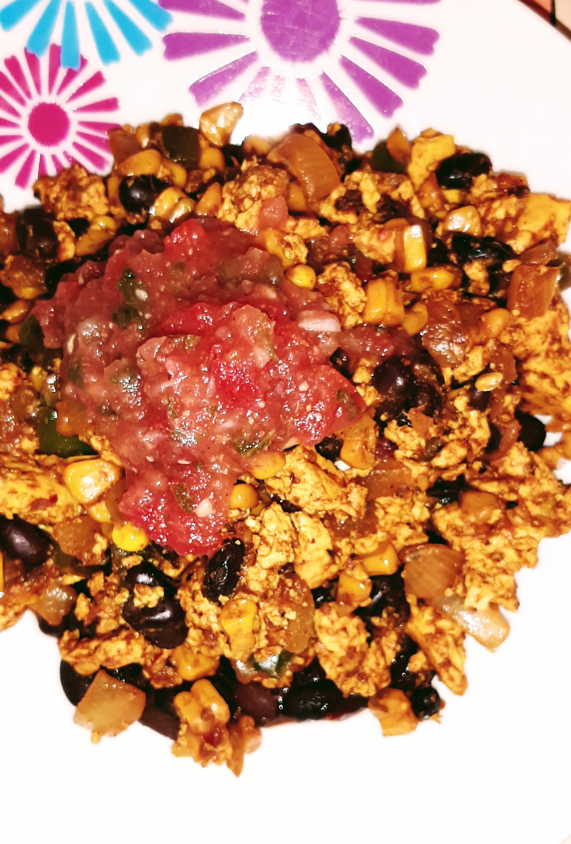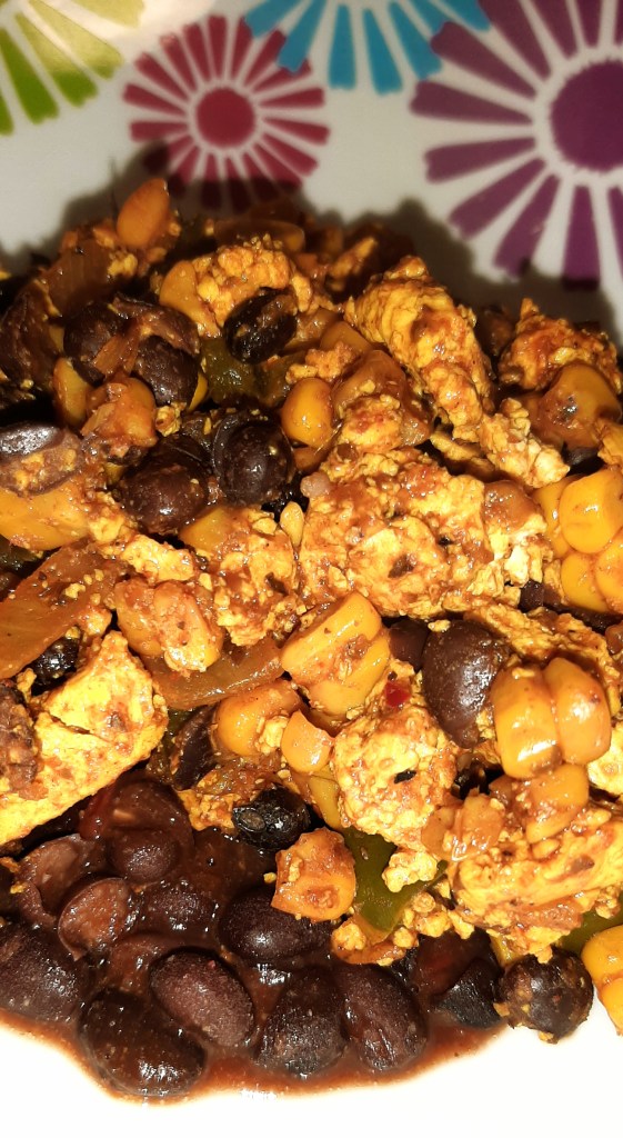 *Cook about 5 minutes or until they start to brown, then add the tofu. Stir regularly until tofu is nice and scrambled. When you have it how you want it, add the drained black beans along with the herbs & spices.