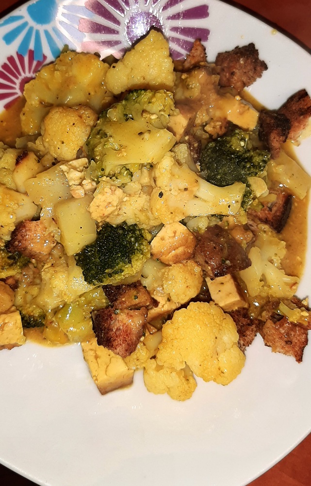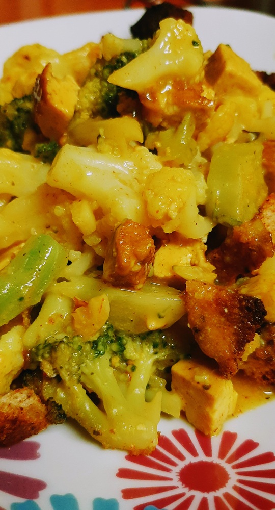 *Stir in broccoli and cauliflower and smoked tofu until everything is mixed well. Add vegan cheddar.
