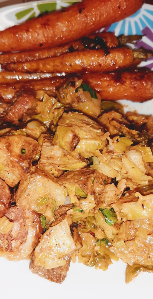 Okay, but here me out. This sounds weird and let’s face it I am a little bit weird but it was a flavor bomb! Potato salad but with gochujang and Brussels sprouts added…and a side of roasted carrots.