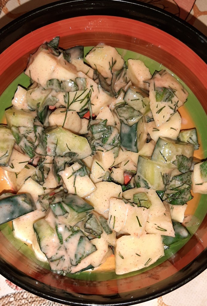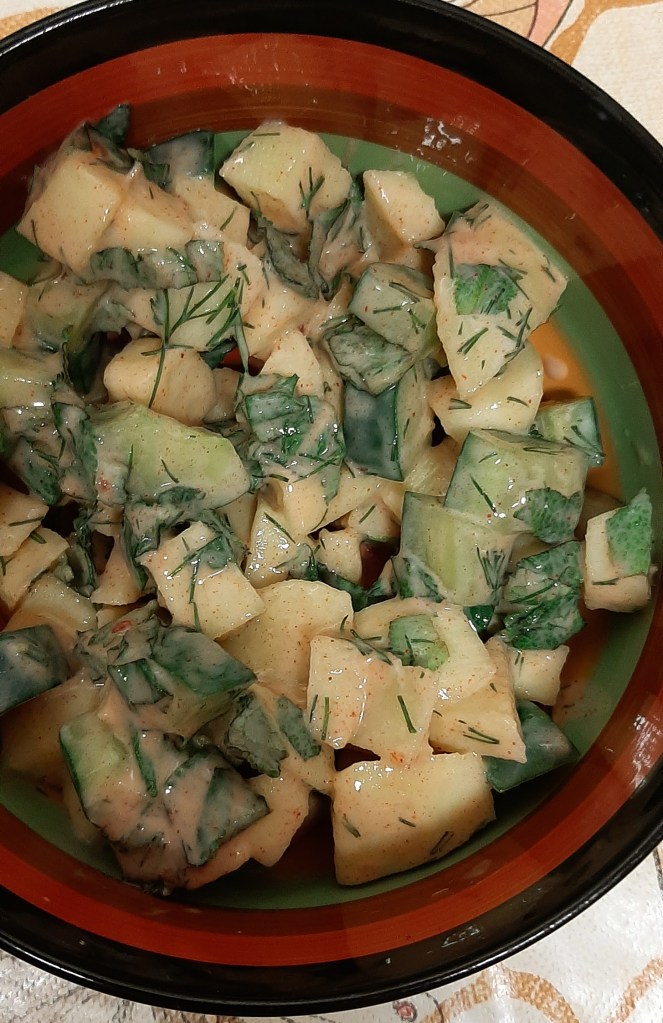 This is a very cool and refreshing salad that works well with spicy dishes like curries, hot wings and the like.