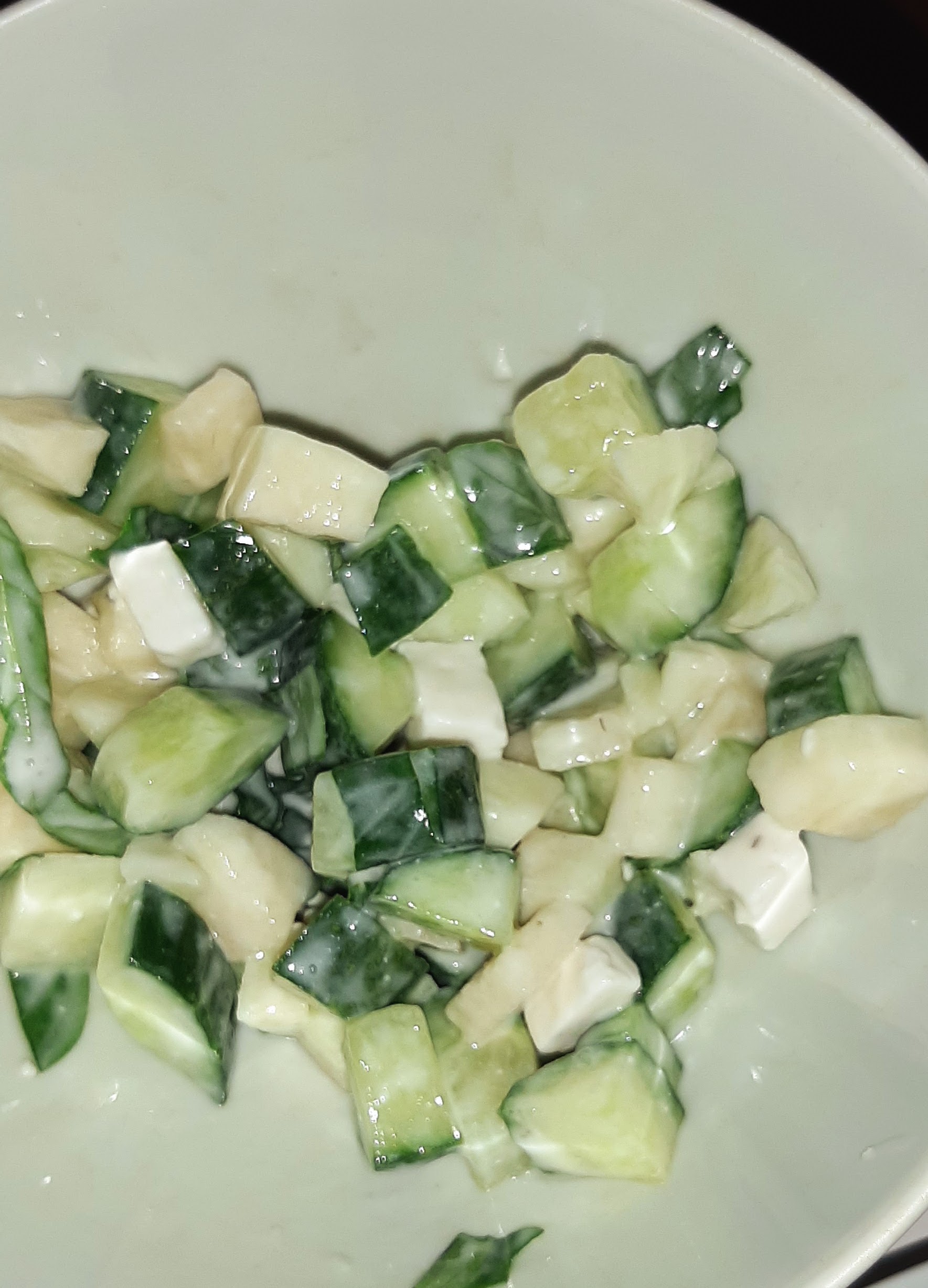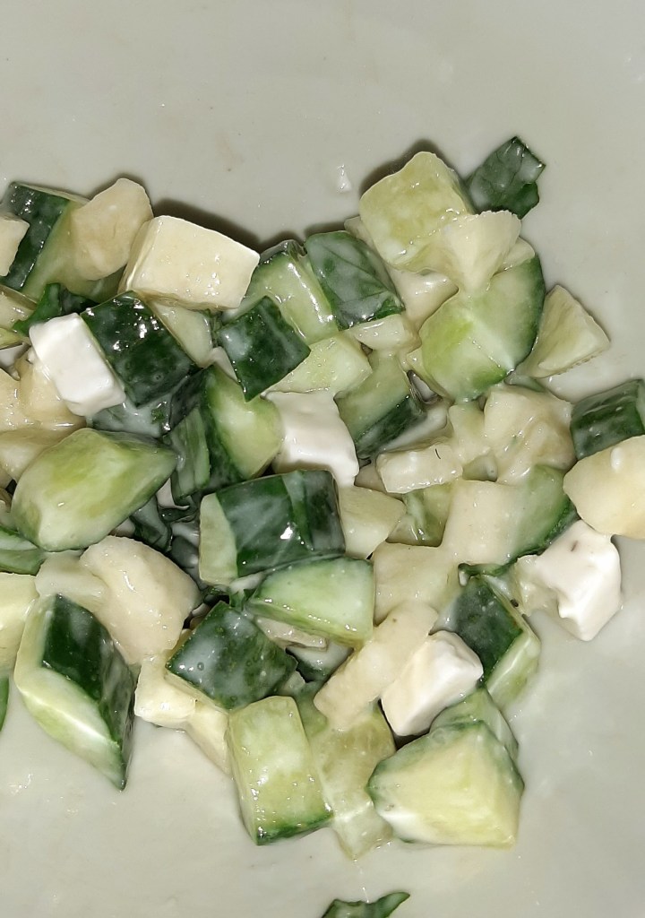 There are quite a few brands of vegan Feta or vegan Greek block and some crumble excellently while others are better diced, to what you’ll do with it depends on what brand you get. I thought it looked nice to dice it to match the apples and cucumbers but hey, you do you.