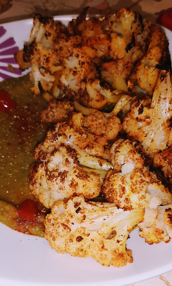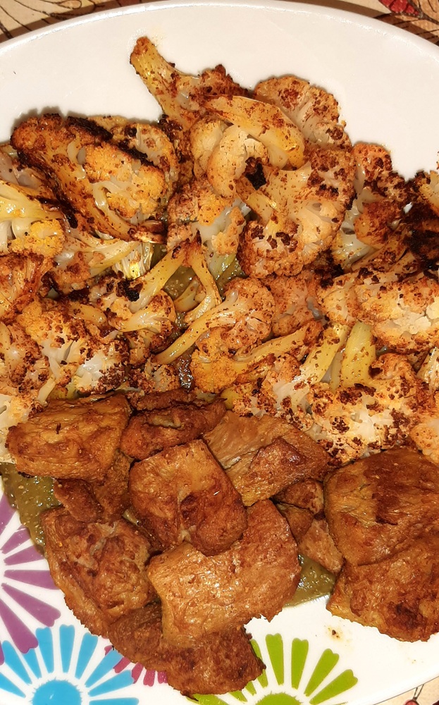 *While the eggplant cooks, chop the cauliflower into uniform pieces to help with the cook time. Season it with your choice of herbs & spices. Cook for 25 to 30 minutes or until tender.