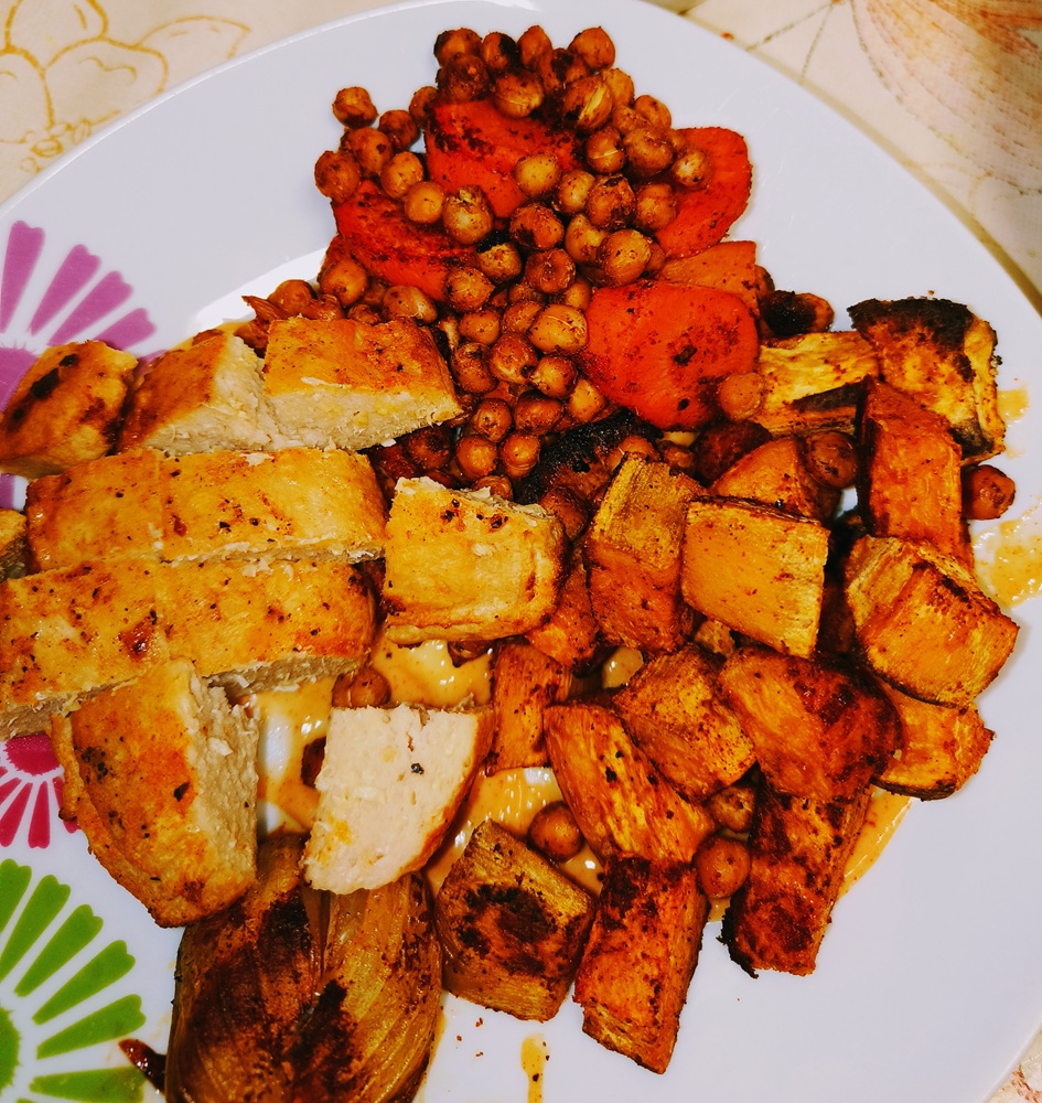 This particular bowl is a protein heavy meal with chickpeas and vegan chicken (Verdino brand pour moi)m sweet potatoes, carrots and onions with a spicy mustard & vegan yogurt sauce.