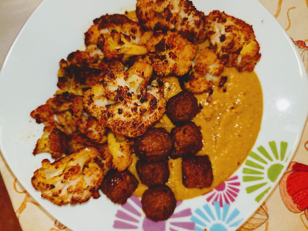 *Cook the vegan balls according to package instructions. I tossed them in with the cauliflower during the last 10 minutes of cooking.