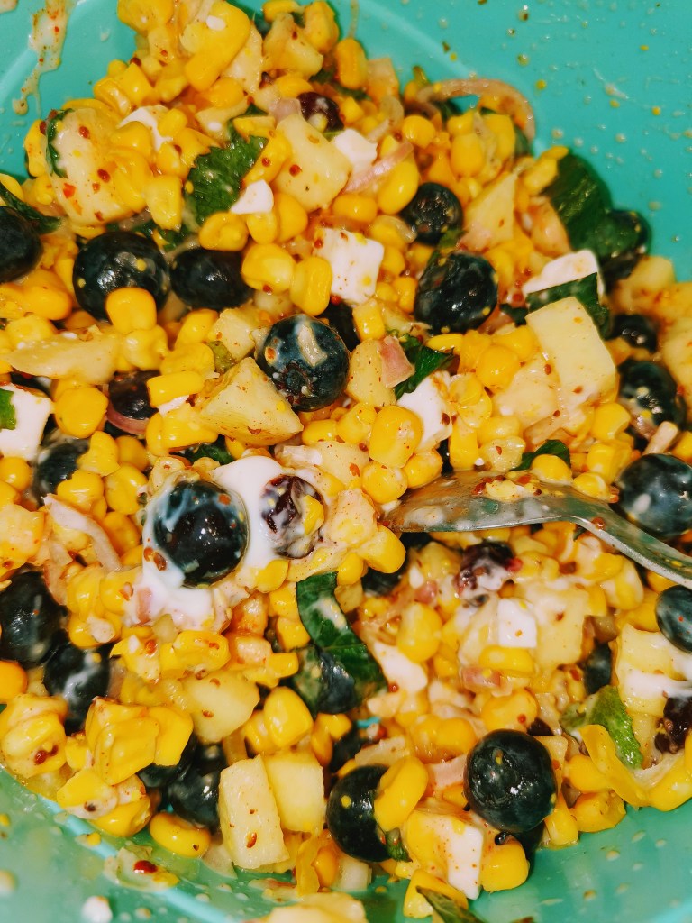 I was a skeptic going into this recipe but I couldn’t deny just how tasty it sounded and looked. I mean deep blue berries and bright yellow corn? Sign me up…twice.