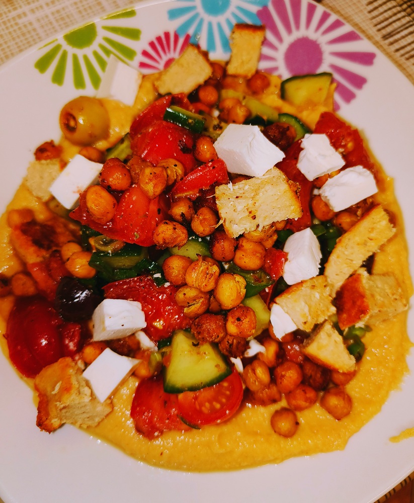Yeah and okay, this salad recipe is like a mix between a Greek salad and a regular ol’ salad. And the hummus is the delicious, creamy, nutty bed that holds it all.