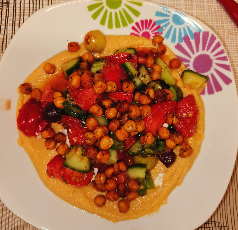 *Spread the hummus on the bottom of your salad plate and top with the vegetables & vegan chicken mixture.
