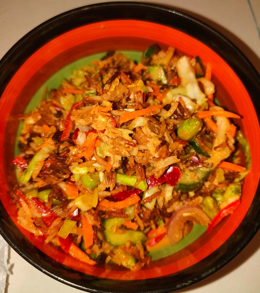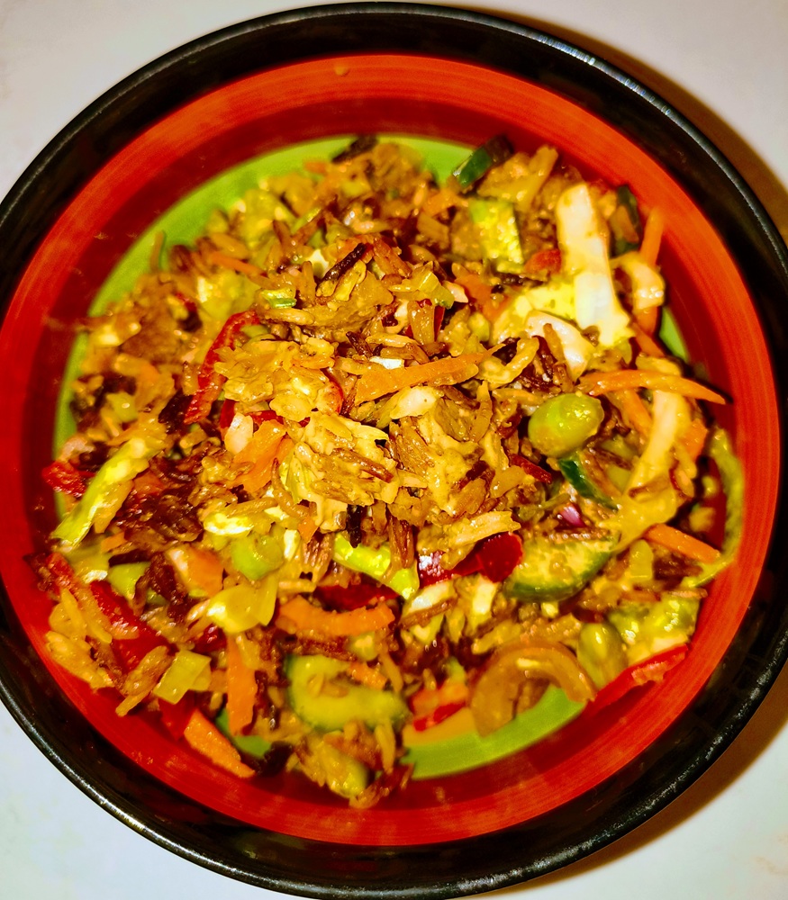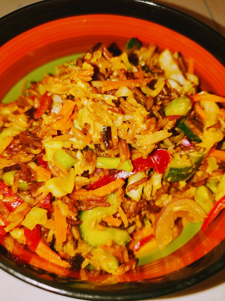 This was a really good vegan salad recipe. It was tasty, full of flavor and nutrients. The one mistake I made was cooking the rice too long, though I did follow the instructions to the letter. It was too sticky (probably from the pepper paste) and it was almost toffee like and not in a good way.