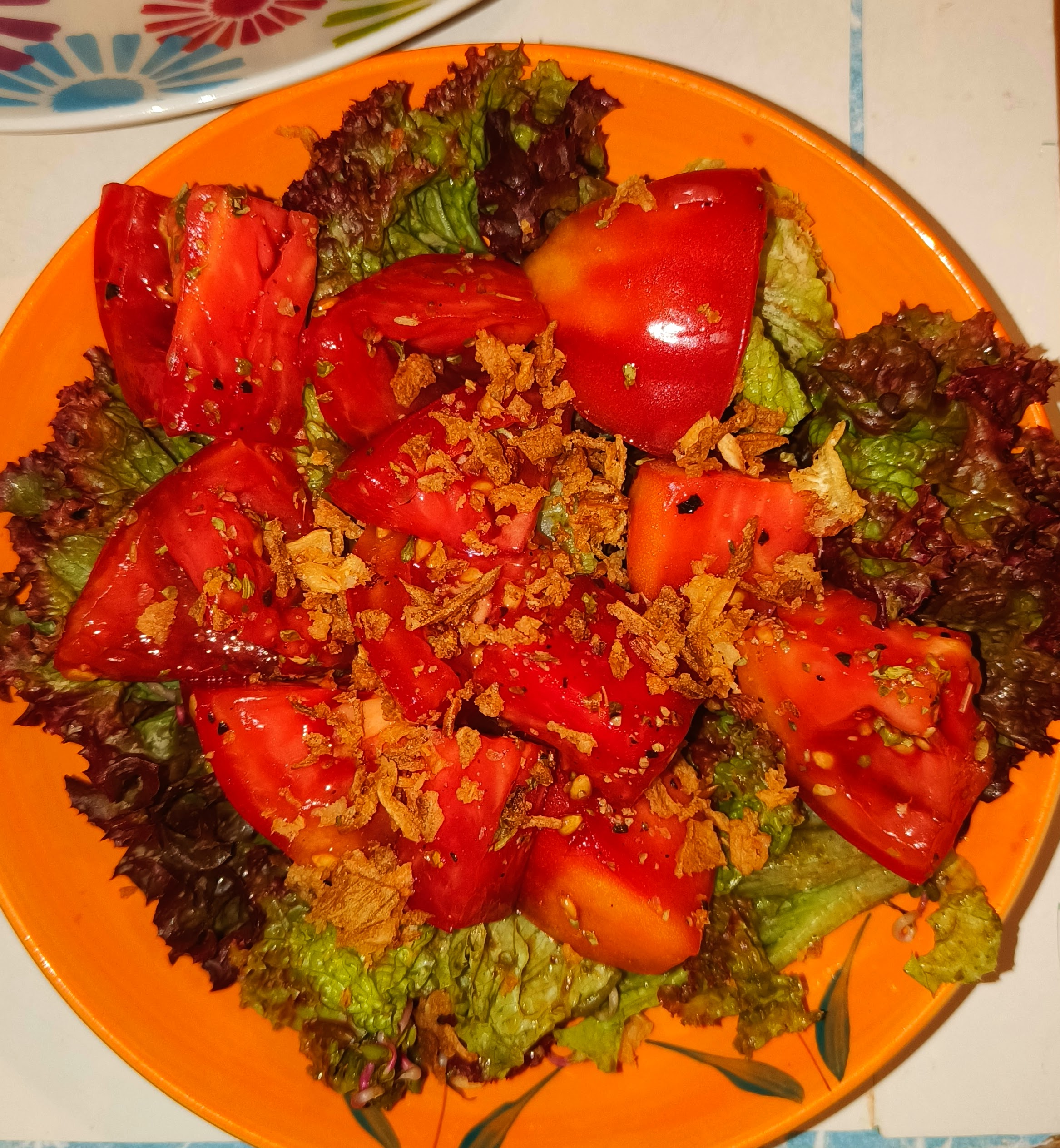 Because it is the summer and heirloom tomatoes are abundant right now, I decided to add a bit of freshness to the meal with a heirloom tomato salad with just lettuce, tomatoes, fried onions and a splash of balsamic vinegar.