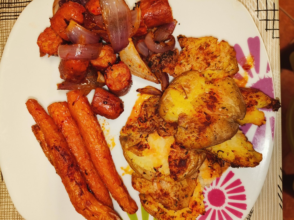 Okay, but seriously. I wanted carrots and I wanted potatoes. But I worked out so I also needed some protein and that’s where the vegan sausage come in and I’m from Chicago so can you really eat any kind of sausage without onions and bell peppers? I think not!