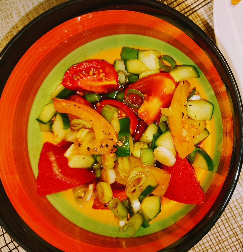 And if you’re feeling like you want a little something fresh in your life, grab some items from your veggie crisper and whip up a side salad. As you can see from the photo this was close to grocery day because I’m using 2 types of tomatoes in the salad…use what you’ve got, it’s better to eat it than waste it!