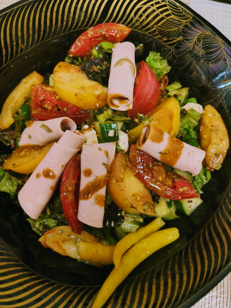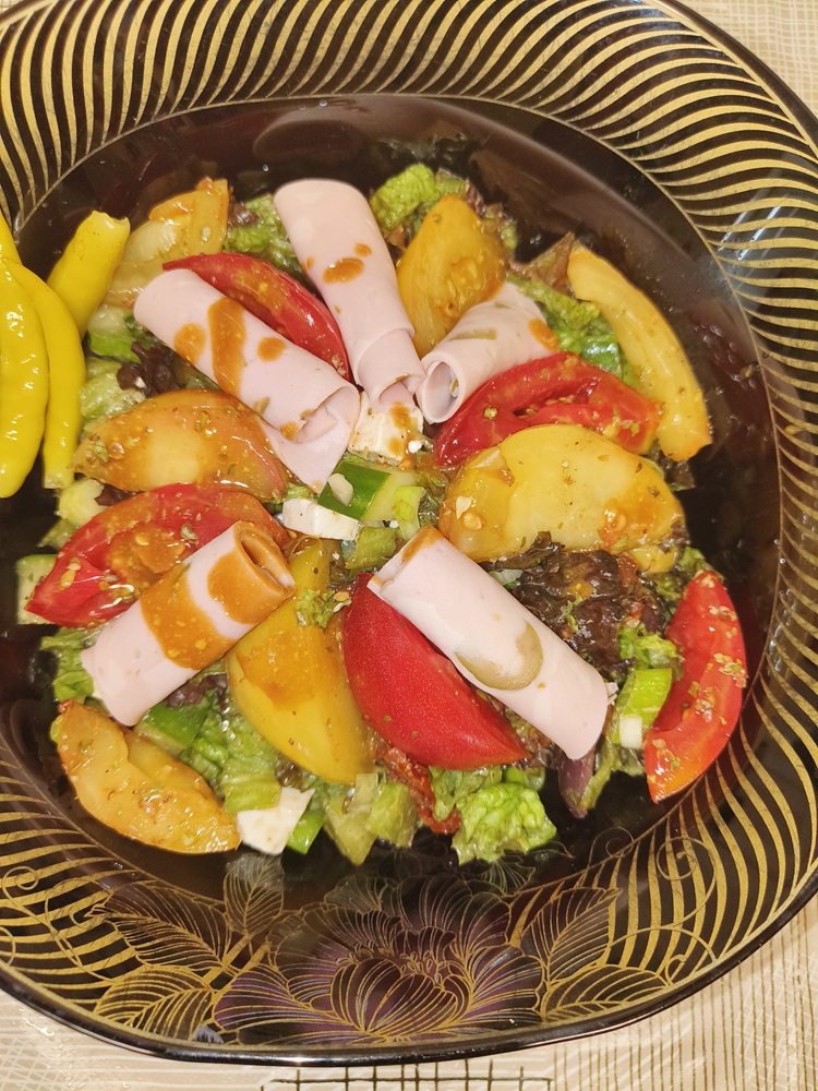 I know it seems weird and yeah, okay, it is, but it’s also good. It’s also a really good way to enjoy all the insides of a sub sandwich without all the bread. I added pepperoncini to my salad, because you can’t really have a deli sandwich without it. Right?