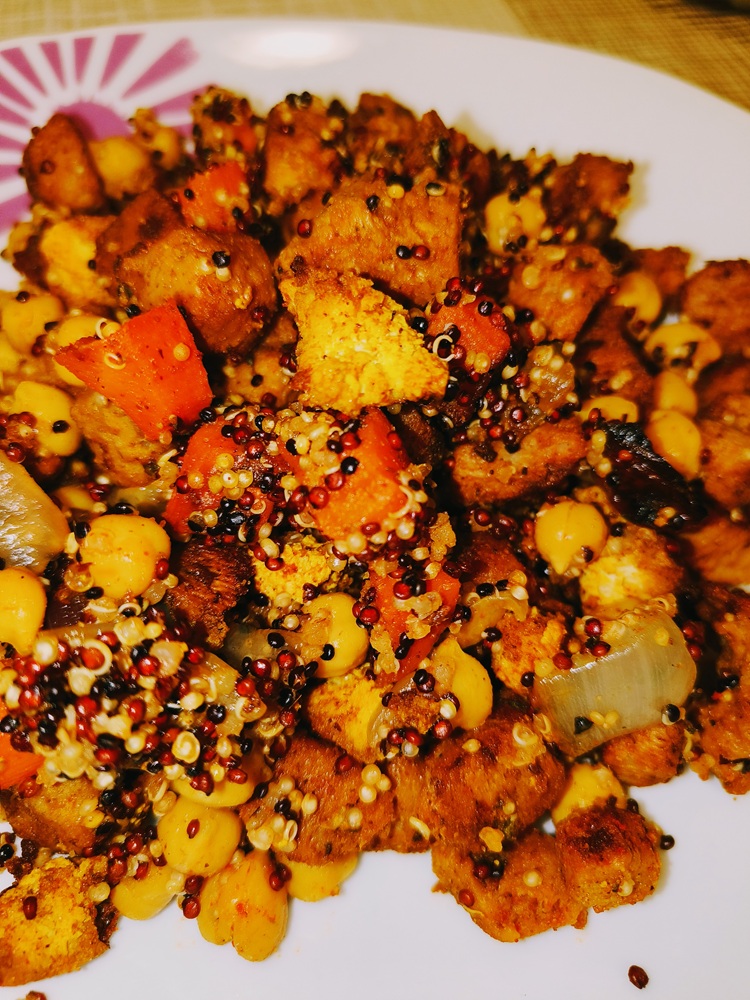 *Chop carrots, onion and tofu, and TVP and season with the herbs & spice blend of your choice. It’s easier if you toss it all into a bowl and season it at once.