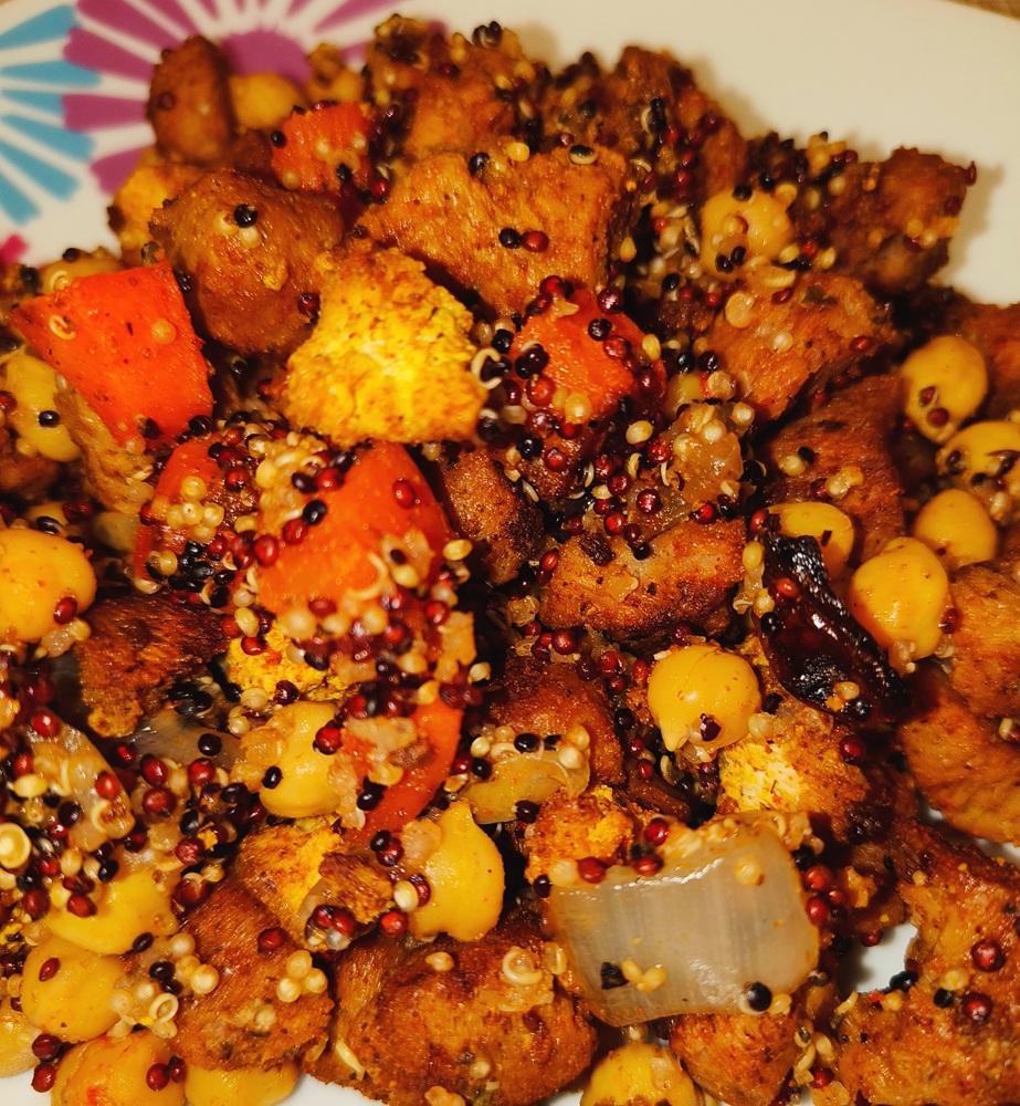 *Chop carrots, onion and tofu, and TVP and season with the herbs & spice blend of your choice. It’s easier if you toss it all into a bowl and season it at once.