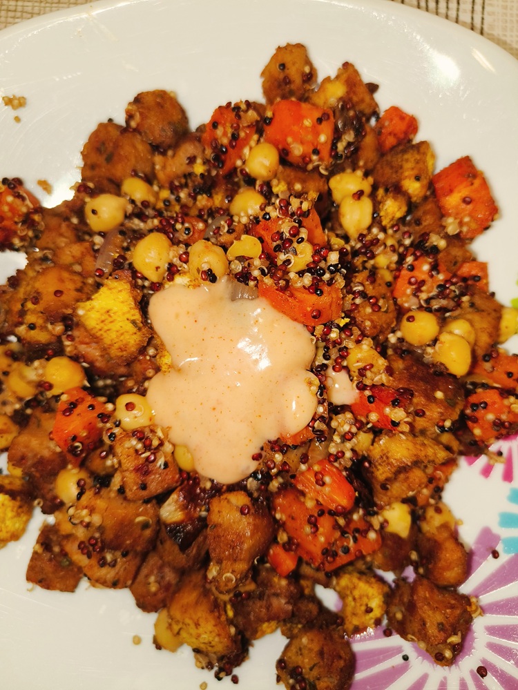 *Mash the cooked garlic in a small mixing bowl and then add the vegan yogurt, whisk until combined. Toss with the veggie & quinoa mix or add a dollop on top.