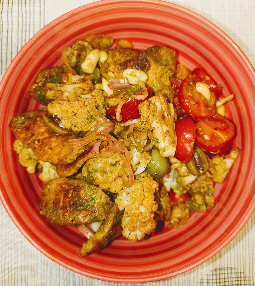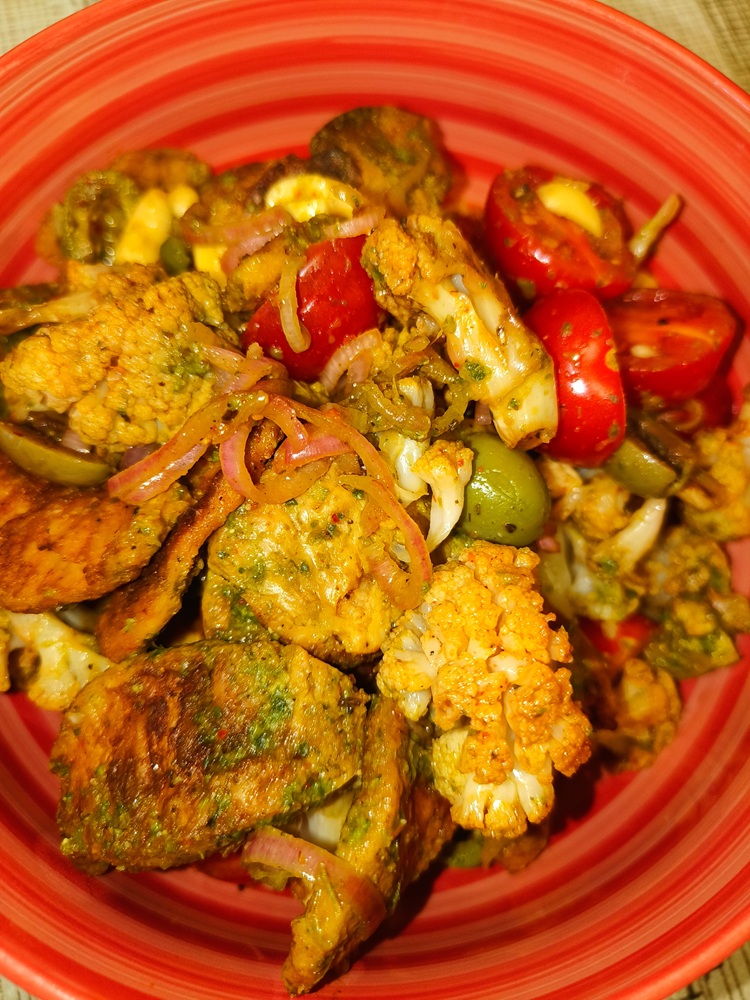 I think this recipe is good as it is, but you can made a mustard based sauce if you think it’s necessary. You can also add grains if you want to flush this meal out but with cauliflower and a healthy amount of protein, it’s really satisfying.