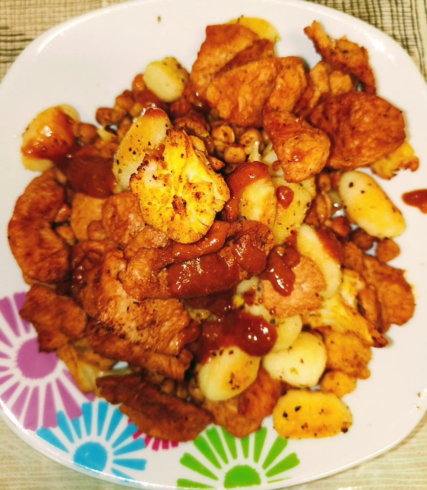 *If using TVP, get it started early if you plan on cooking in the oven, or pop it in the air fryer. It only takes 10 minutes so if you do 2 batches it should finish up right as the rest of the food is done.