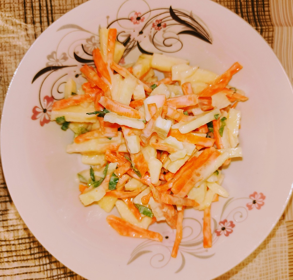 I made a small salad on the side with carrots, apple, mint, lime zest and cocogurt. It was simple, refreshing and delicious.