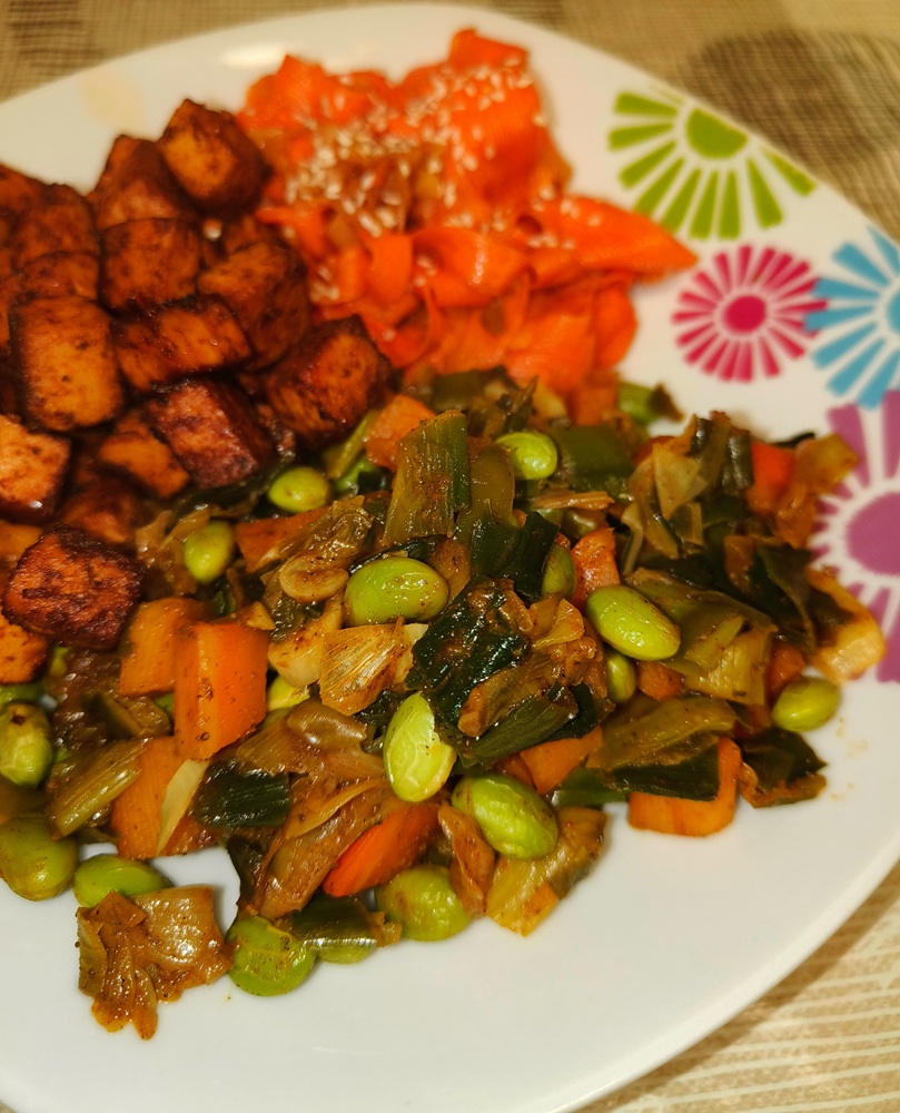 *Edamame salad: Place a skillet over medium heat and add the leeks and carrots, cooking for 5 minutes or until soft. Add water or broth if necessary to keep it from sticking. Toss sliced garlic in along with edamame and cook another 5 to 7 minutes. Stir in chopped lemon peel or lemon zest and soy sauce. cook until everything is heated through and turn off heat.